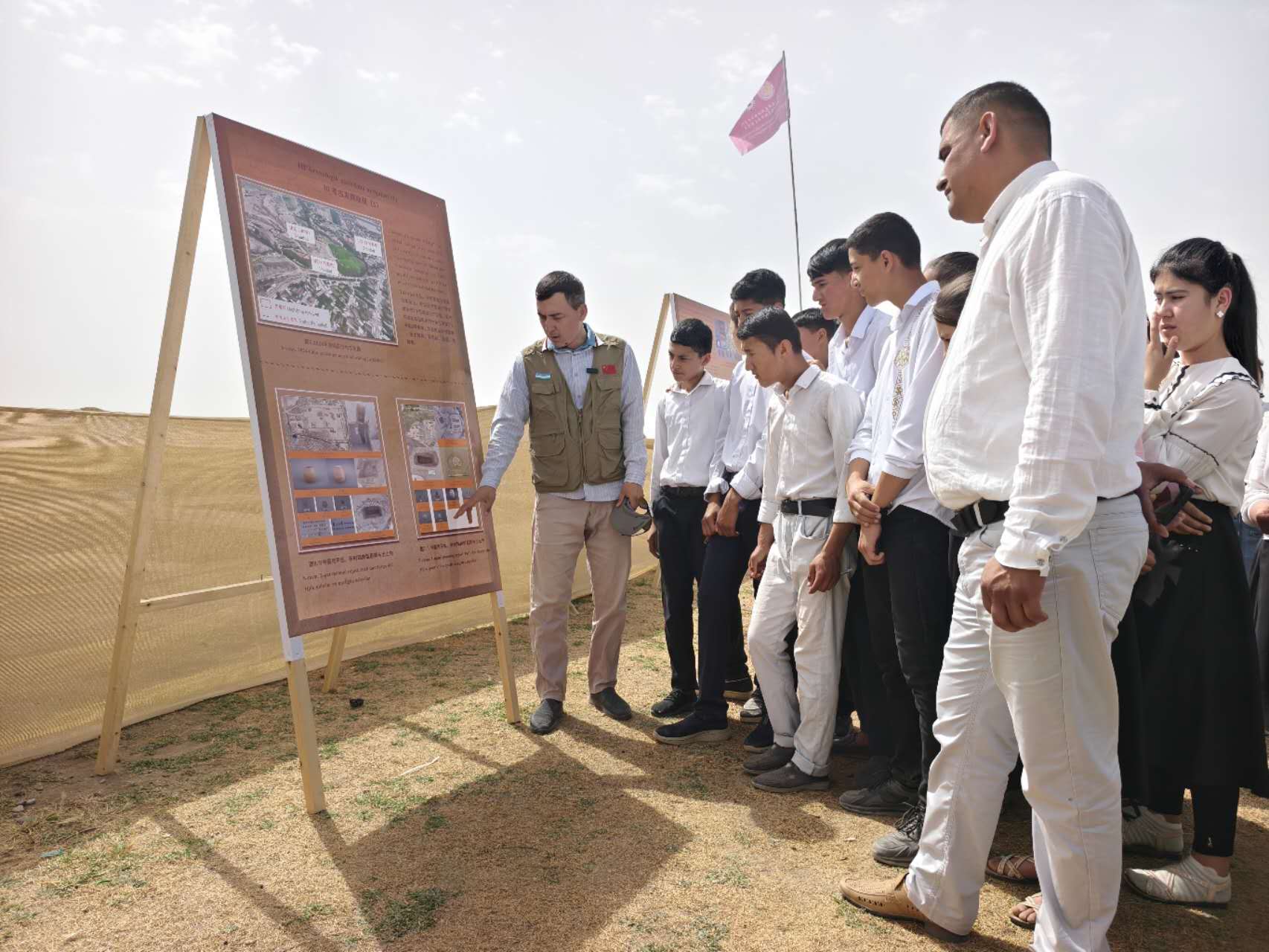 2025国际博物馆日期间,中国-乌兹别克斯坦联合考古队举办公众考古活动。乌兹别克斯坦的40余名中小学生、迪诺大学历史学院10余名本科生,走进古丝绸之路上沉寂千年的契纳尔特佩遗址,在考古队员的带领下,开启了一场跨越时空的文化寻根之旅,以生动的形式架起了历史遗产与未来传承的桥梁。