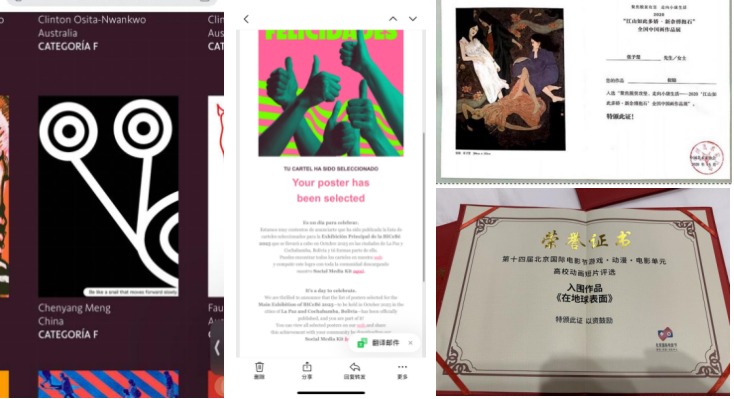 近五年来,艺术学院共申报大学生创新创业训练计划项目118项,获国家级立项 37项,省部级立项 78 项;学生作品《玻璃弹珠》《窗外的客人》《我们的祖先曾是鱼》入围2025年第15届北京国际电影节游戏·动漫·电影单元、《玻璃弹珠》获第24届北京电影学院动画学院优秀学生作业奖。作品“be like a snail”入选“第九届玻利维亚国际海报双年展”。