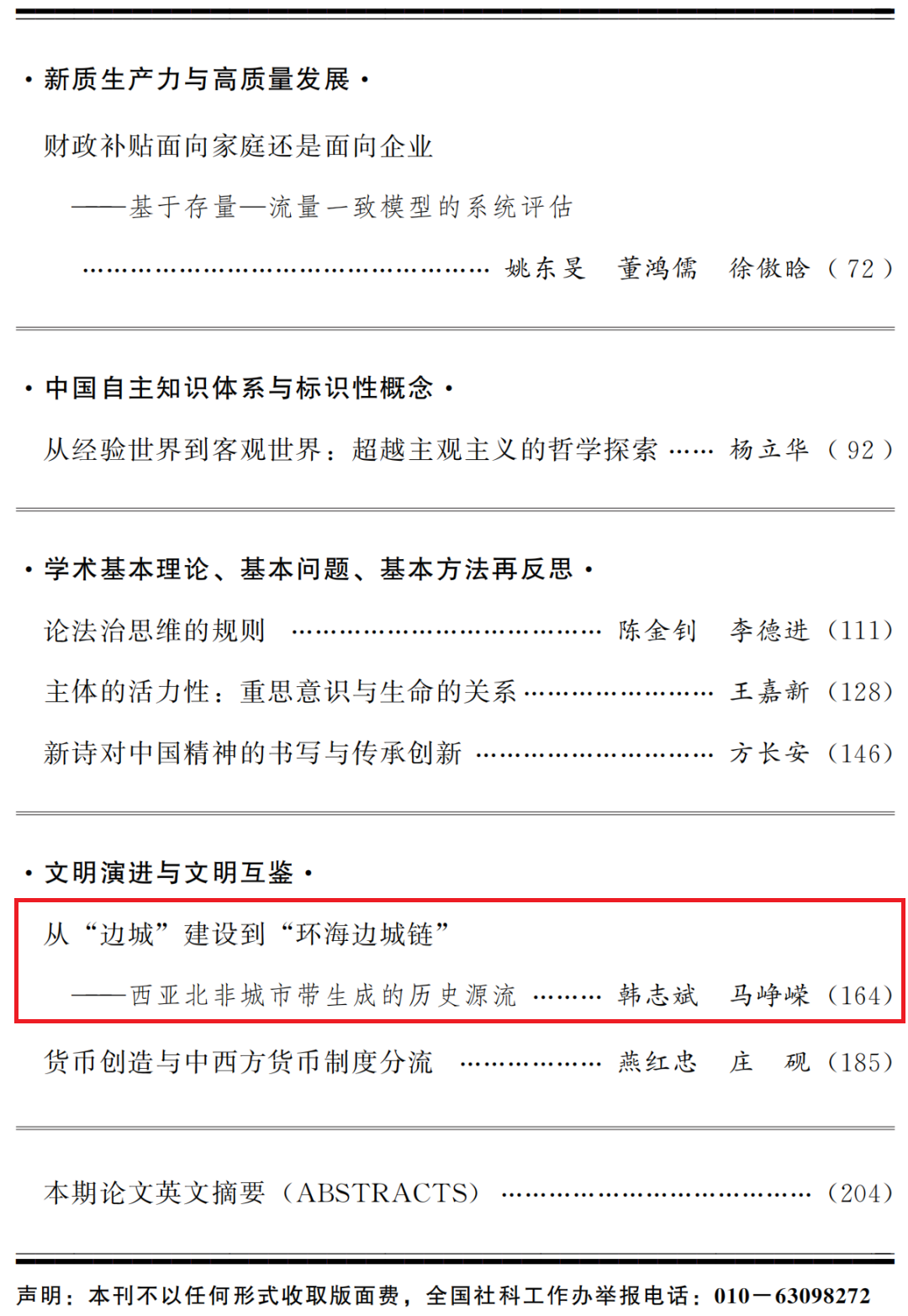 近日,开云手机网页版登录入口区域国别学院中东研究所韩志斌教授和博士研究生马峥嵘在《中国社会科学》2025年第5期上发表了专题论文《从“边城”建设到“环海边城链”——西亚北非城市带生成的历史源流》。本文是韩志斌教授主持的国家社会科学基金重大项目“中东史学通史(五卷本)”的阶段性成果之一。这是学校教学科研人员时隔三年在《中国社会科学》杂志上发表文章,是学校在区域国别研究方面取得的突破性进展。