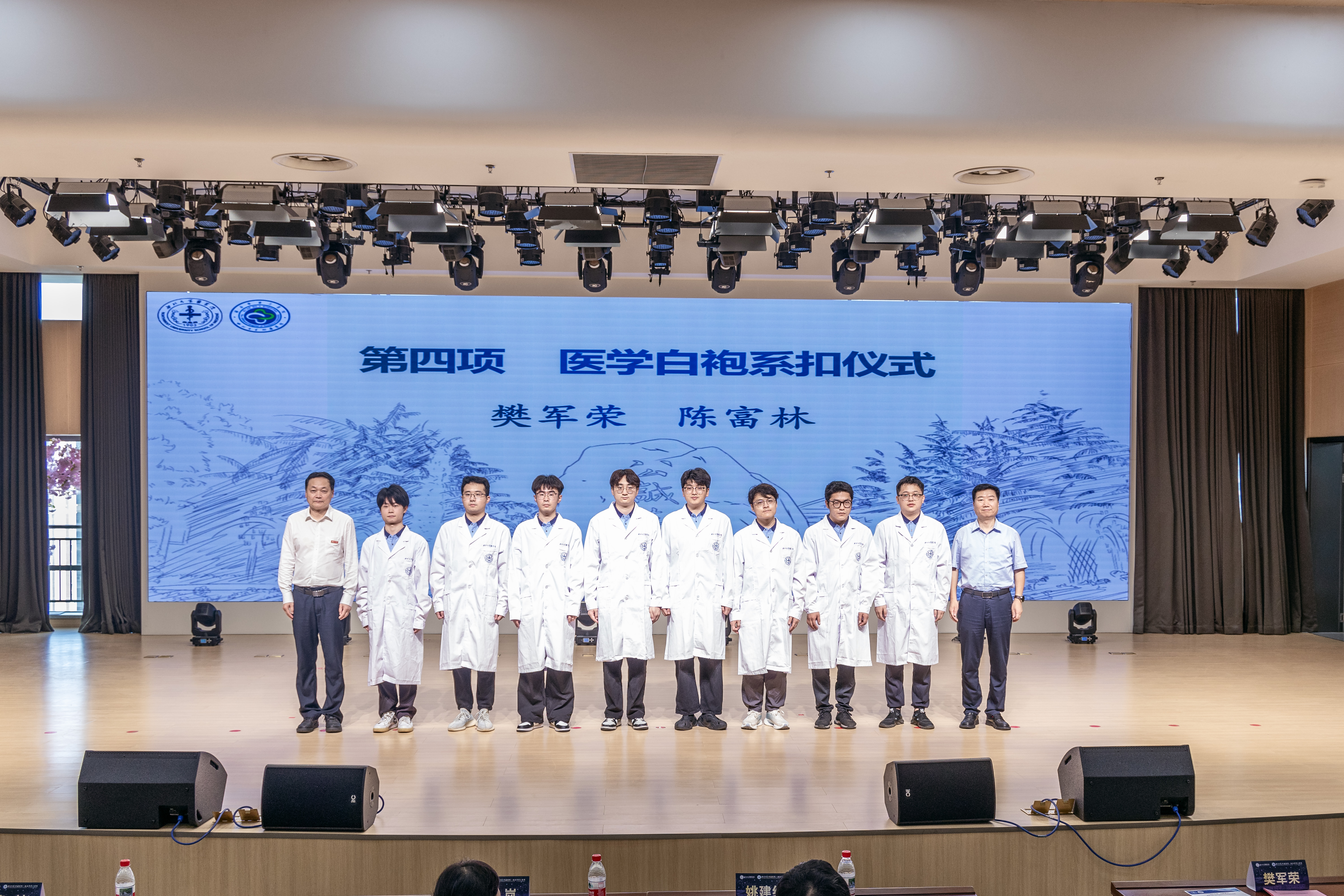 在医学白袍系扣仪式上,樊军荣、陈富林为毕业生白袍系扣,砥砺同学们牢记学医初心,践行医学誓言。