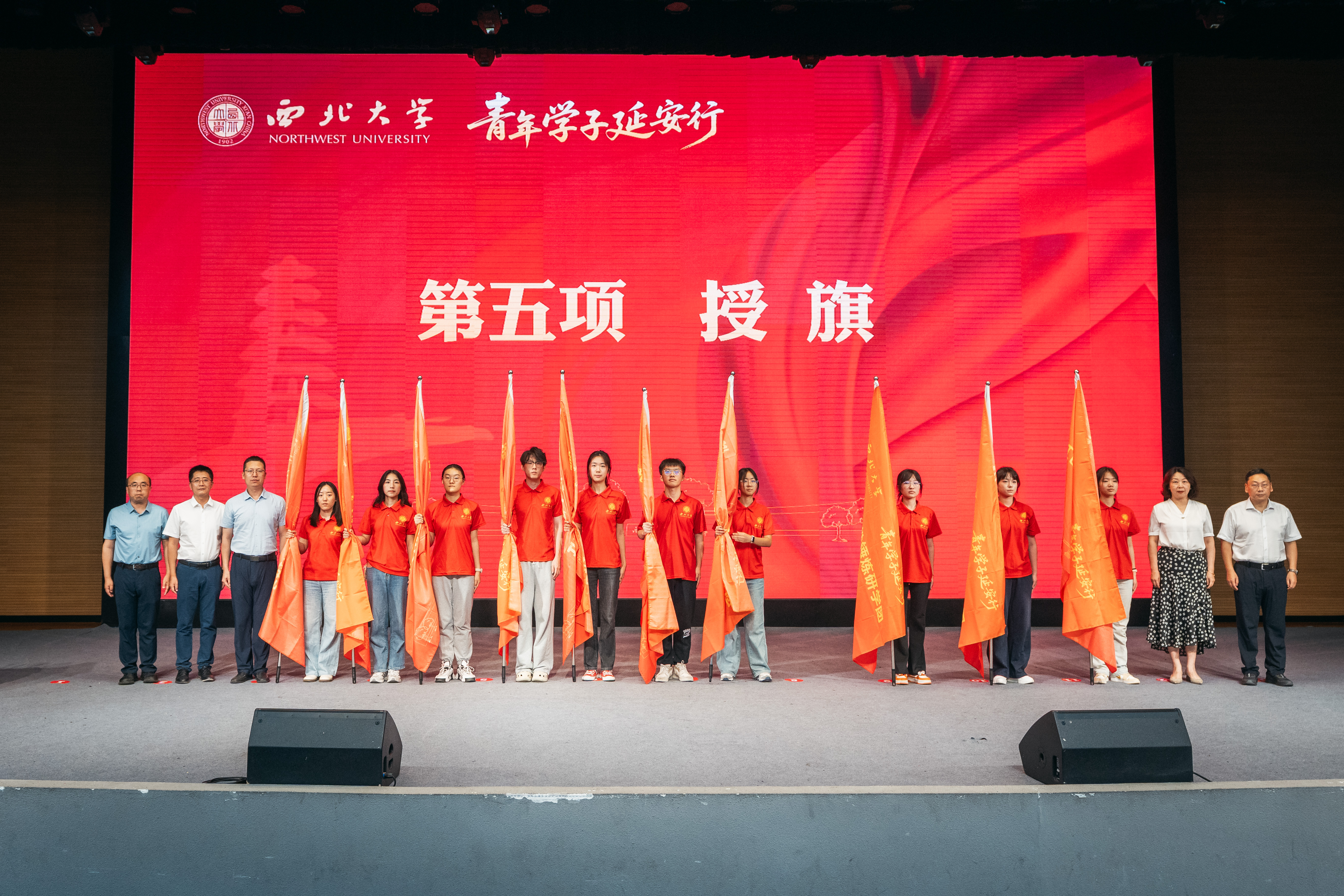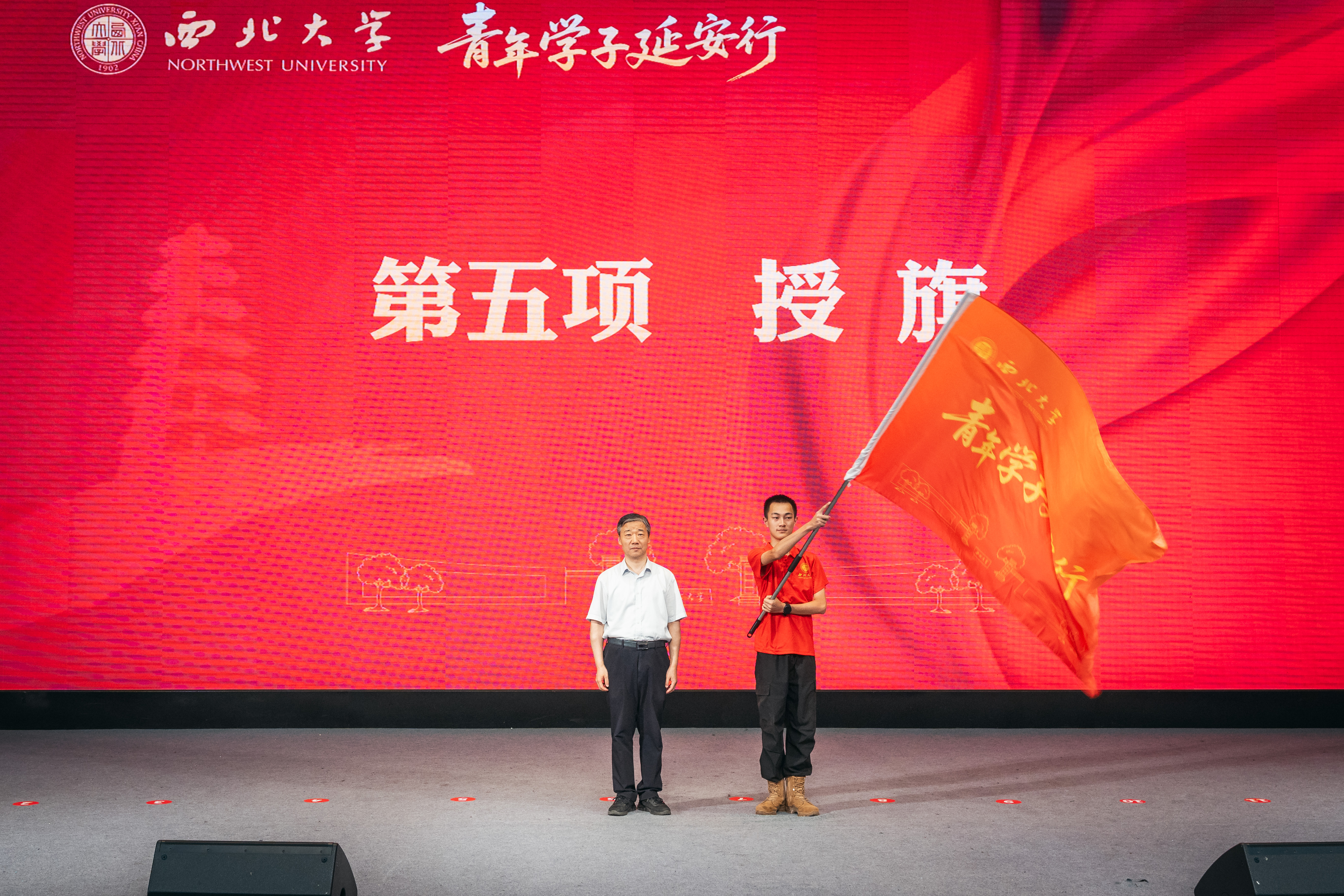 活动中,蒋林和与会部门负责人为“开云手机网页版登录入口青年学子延安行”研学团和10个班级代表授旗。