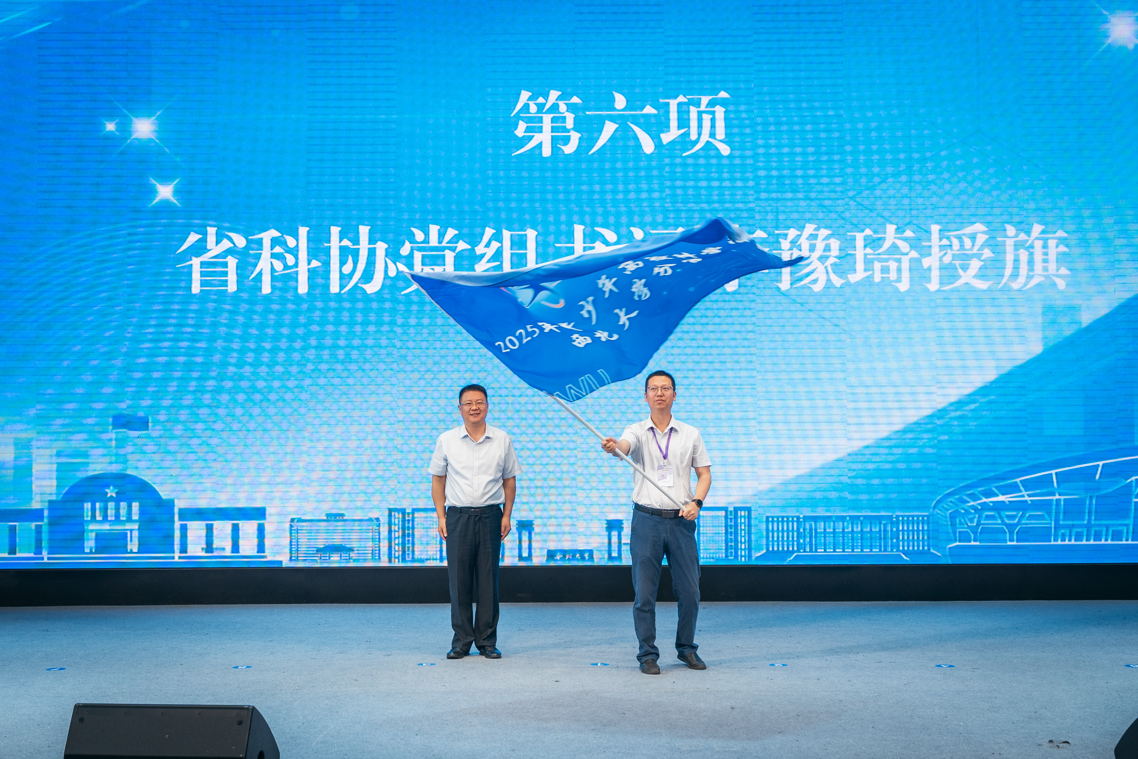李豫琦为陕西省青少年高校科学营开云手机网页版登录入口分营授旗,校团委负责人接旗。