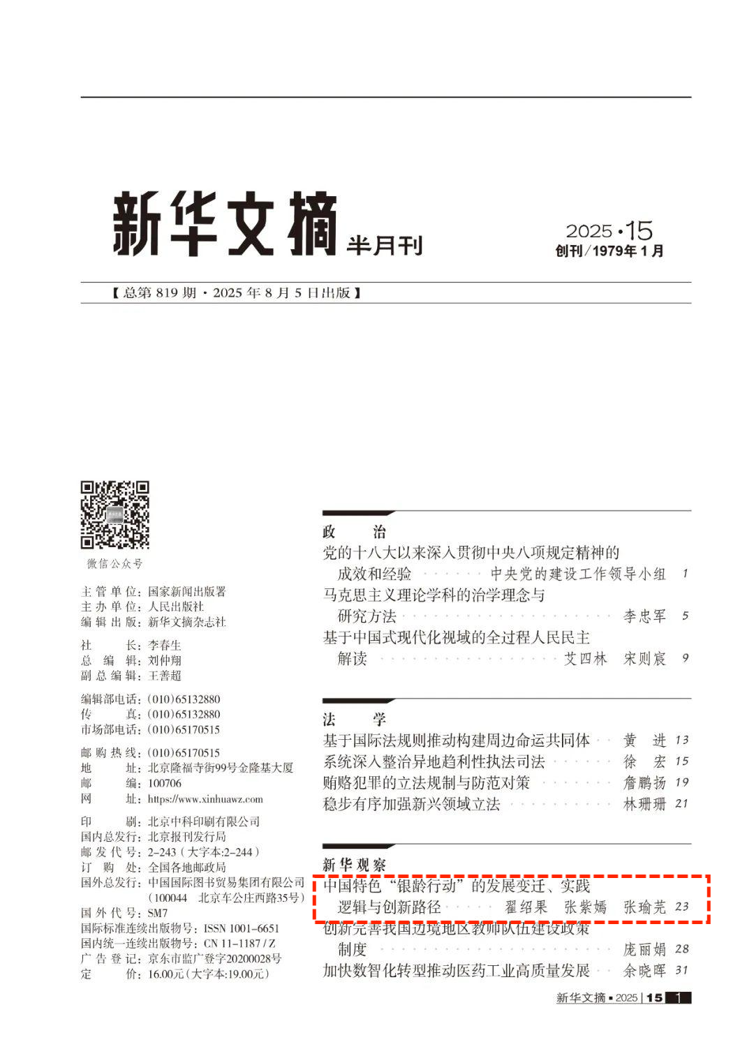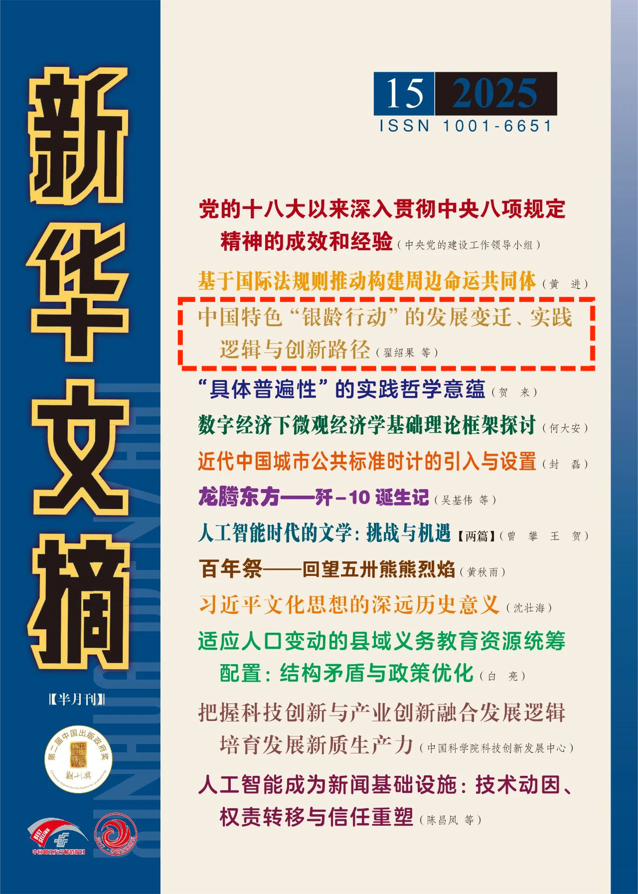近日,开云手机网页版登录入口公共管理学院翟绍果教授及博士生张紫嫣、张瑜芜发表的论文《中国特色“银龄行动”的发展变迁、实践逻辑与创新路径》(原载于《开云手机网页版登录入口学报(哲学社会科学版)》2025年第3期)被《新华文摘》2025年第15期作为封面文章全文转载。