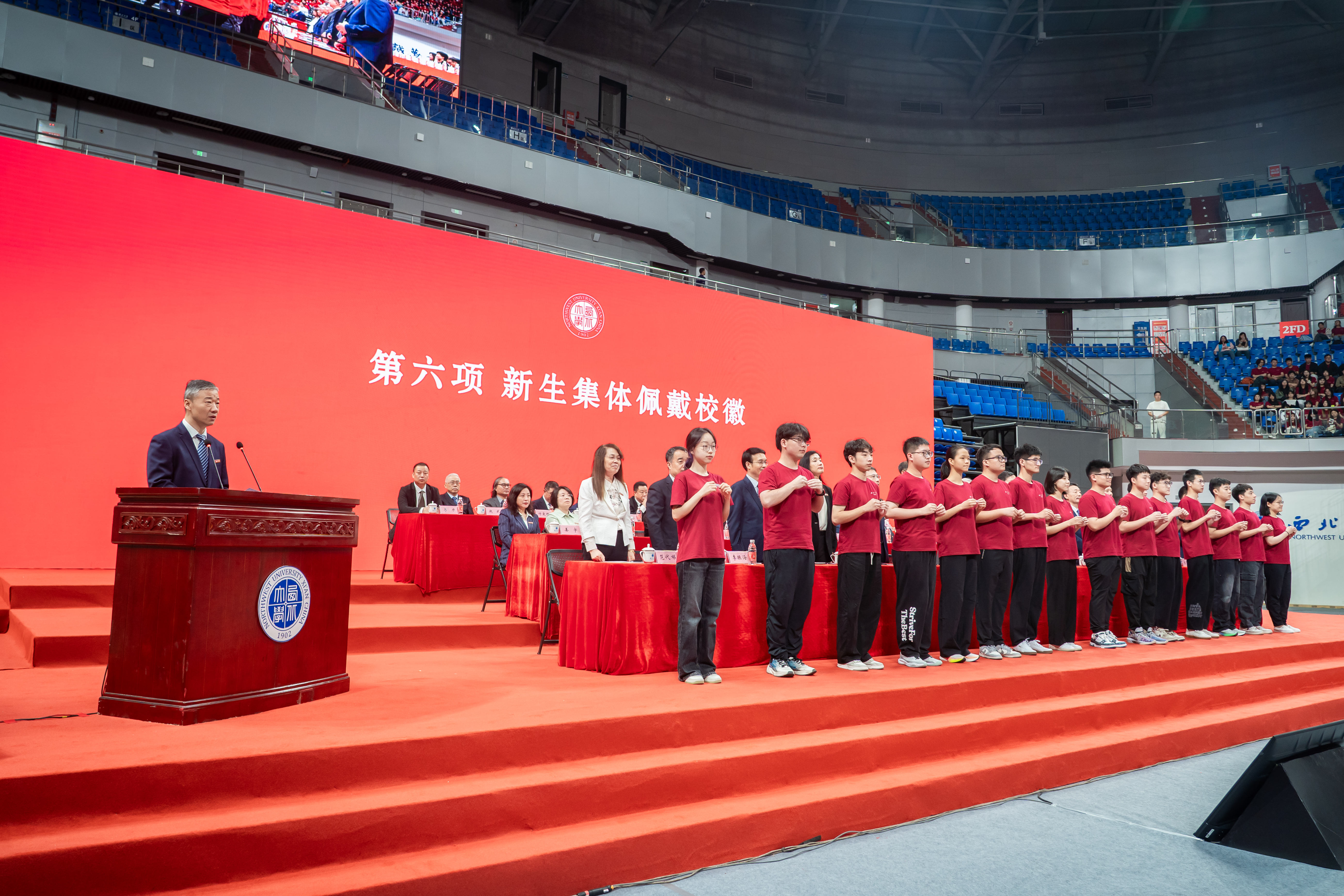 随后,主席台前排领导为新生代表颁发校徽,全体同学将“开云手机网页版登录入口校徽”庄重佩戴在胸前。校徽承载着西大人的初心和使命,饱含着老师们的祝福与期望。今天正式佩戴校徽后,同学们便与西大血脉相连,“公诚勤朴”的校训精神也将在新一届学子中传承发扬,汇聚成强国有我、奋进新征程的精神伟力。