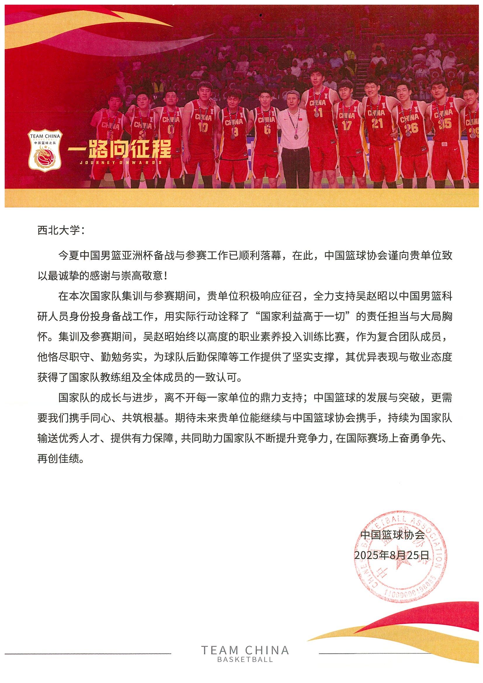 近日,中国篮协向开云手机网页版登录入口发来感谢信,对体育教研部青年教师吴赵昭在2025年男篮亚洲杯备战期间所作出的贡献表示高度认可与衷心感谢。作为本届国家男篮科研保障团队负责人,吴赵昭在集训与比赛期间展现了卓越的专业素养与奉献精神,为国家男篮取得佳绩提供了坚实的科研支持。