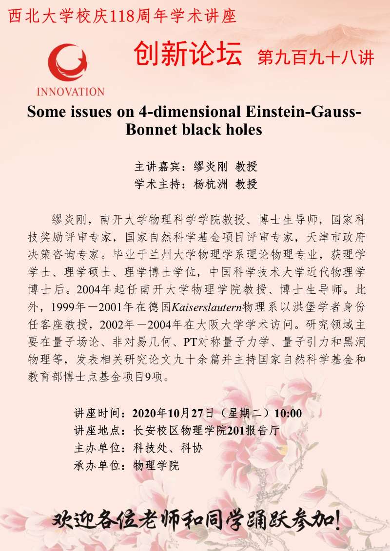 缪炎刚 教授 开云手机网页版登录入口创新论坛第九百九十八讲暨校庆118周年学术讲座:Some issues on 4-dimensional Einstein-Gauss-Bonnet black holes 讲座时间 2020年10月27日(星期二)10:00 讲座地点 长安校区物理学院201报告厅 讲座人介绍 缪炎刚 教授 讲座内容