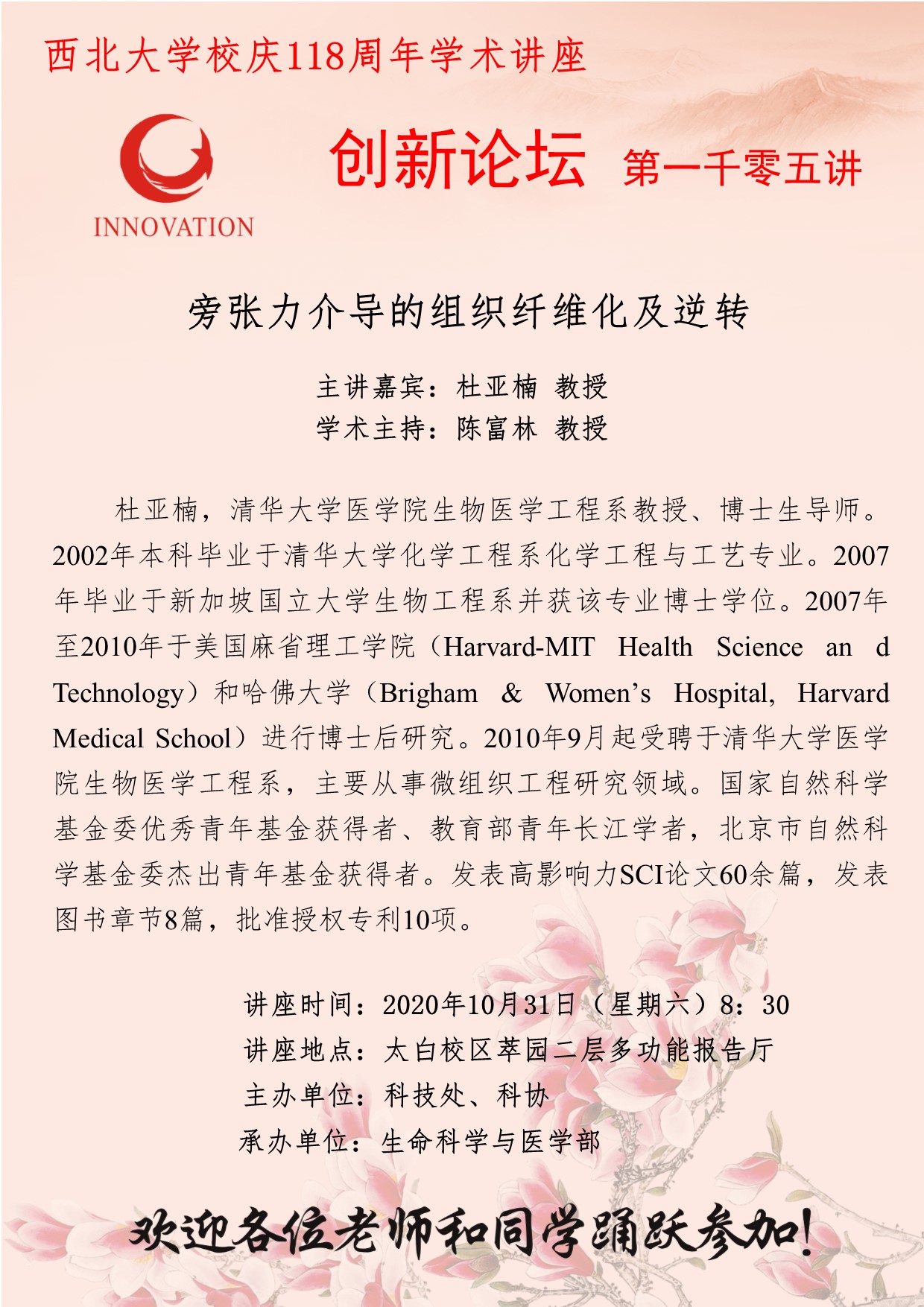 杜亚楠 教授 开云手机网页版登录入口创新论坛第一千零五讲暨校庆118周年学术讲座:旁张力介导的组织纤维化及逆转 讲座时间 2020年10月31日(星期六)8:30 讲座地点 太白校区萃园二层多功能报告厅 讲座人介绍 杜亚楠 教授 讲座内容