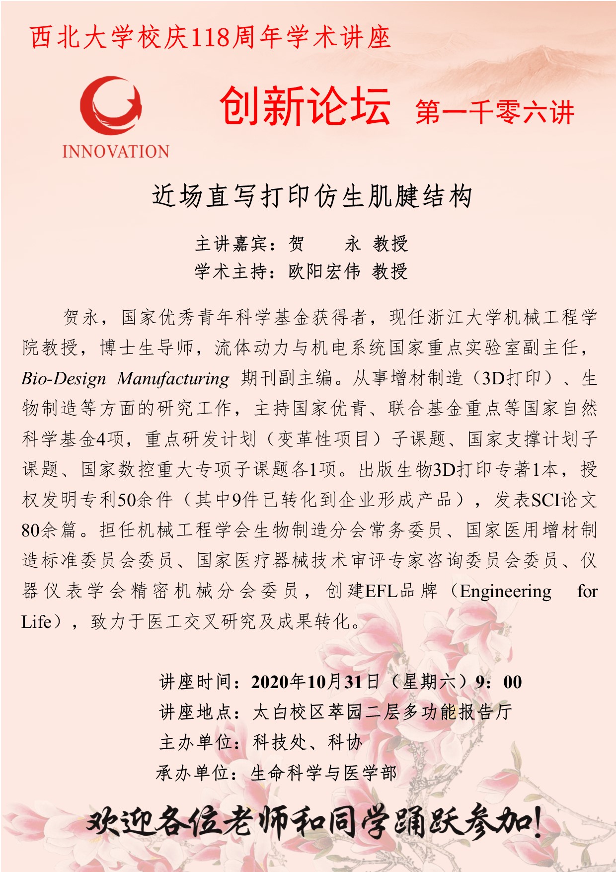 贺永 教授 开云手机网页版登录入口创新论坛第一千零六讲暨校庆118周年学术讲座:近场直写打印仿生肌腱结构 讲座时间 2020年10月31日(星期六)9:00 讲座地点 太白校区萃园二层多功能报告厅 讲座人介绍 贺永 教授 讲座内容