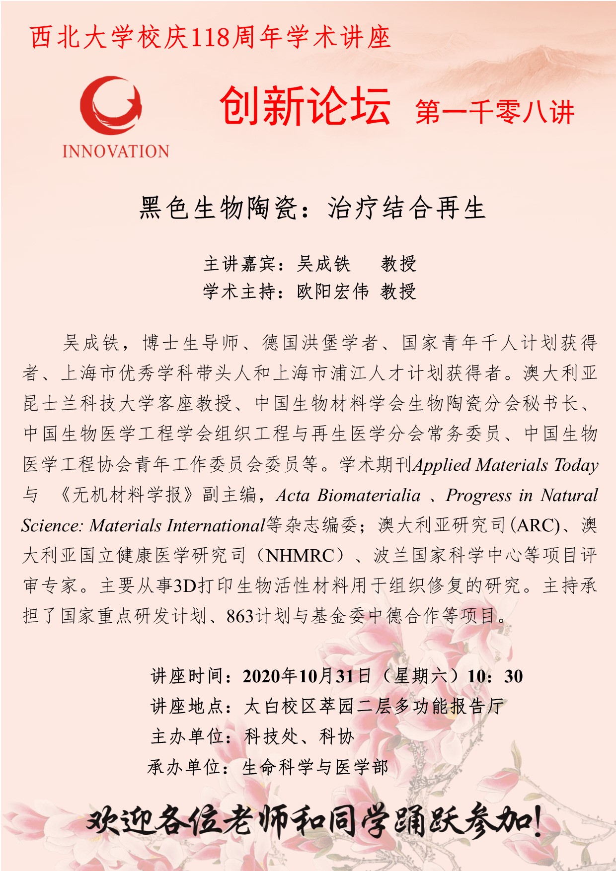 吴成铁 教授 开云手机网页版登录入口创新论坛第一千零八讲暨校庆118周年学术讲座:黑色生物陶瓷:治疗结合再生 讲座时间 2020年10月31日(星期六)10:30 讲座地点 太白校区萃园二层多功能报告厅 讲座人介绍 吴成铁 教授 讲座内容
