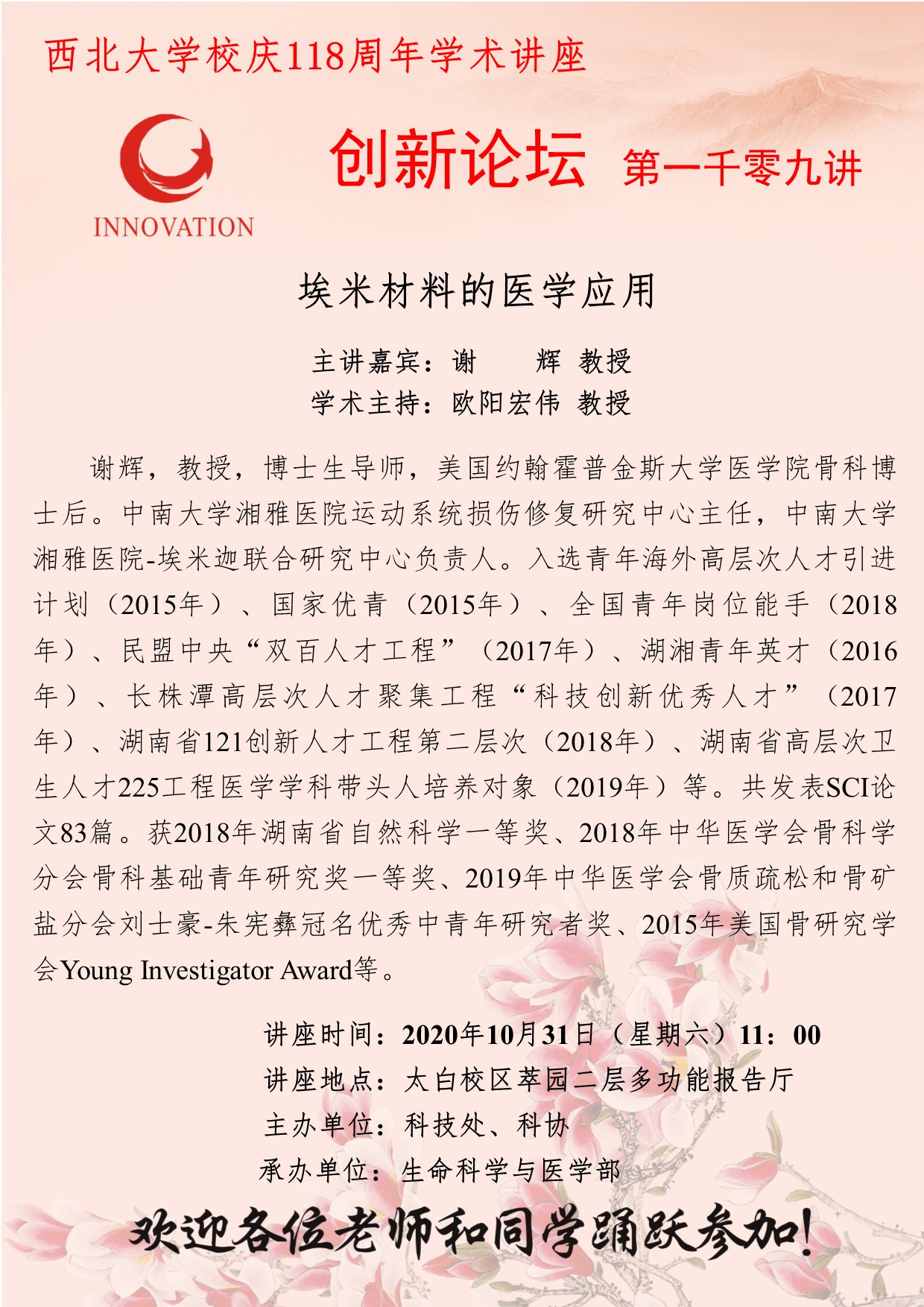 谢辉 教授 开云手机网页版登录入口创新论坛第一千零九讲暨校庆118周年学术讲座:埃米材料的医学应用 讲座时间 2020年10月31日(星期六)11:00 讲座地点 太白校区萃园二层多功能报告厅 讲座人介绍 谢辉 教授 讲座内容