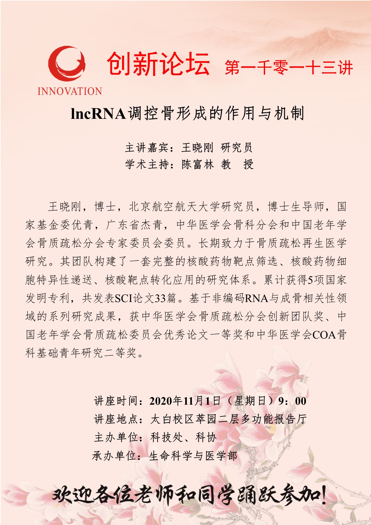 王晓刚 研究员 开云手机网页版登录入口创新论坛第一千零一十三讲:lncRNA调控骨形成的作用与机制 讲座时间 2020年11月1日(星期日)9:00 讲座地点 太白校区萃园二层多功能报告厅 讲座人介绍 王晓刚 研究员 讲座内容