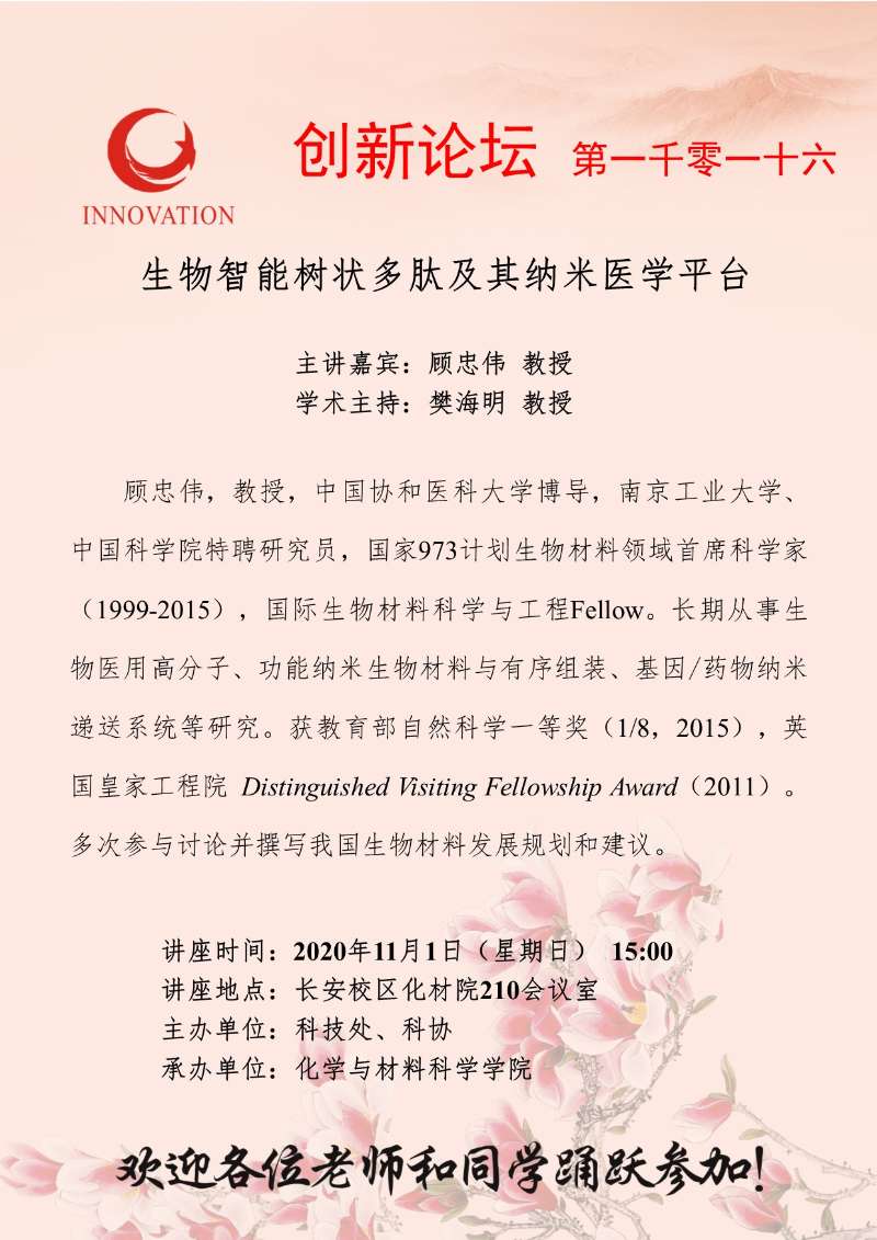 顾忠伟 教授 开云手机网页版登录入口创新论坛第一千零一十六讲:生物智能树状多肽及其纳米医学平台 讲座时间 2020年11月1日(星期日) 15:00 讲座地点 长安校区化材院210会议室 讲座人介绍 顾忠伟 教授 讲座内容