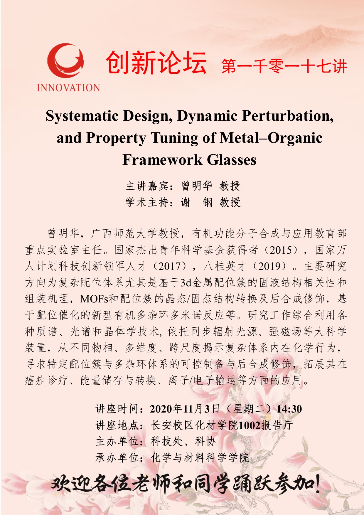 曾明华 教授 开云手机网页版登录入口创新论坛第一千零一十七讲:Systematic Design, Dynamic Perturbation, and Property Tuning of Metal–Organic Framework Glasses 讲座时间 2020年11月3日(星期二)14:30 讲座地点 长安校区化材学院1002报告厅 讲座人介绍 曾明华 教授 讲座内容
