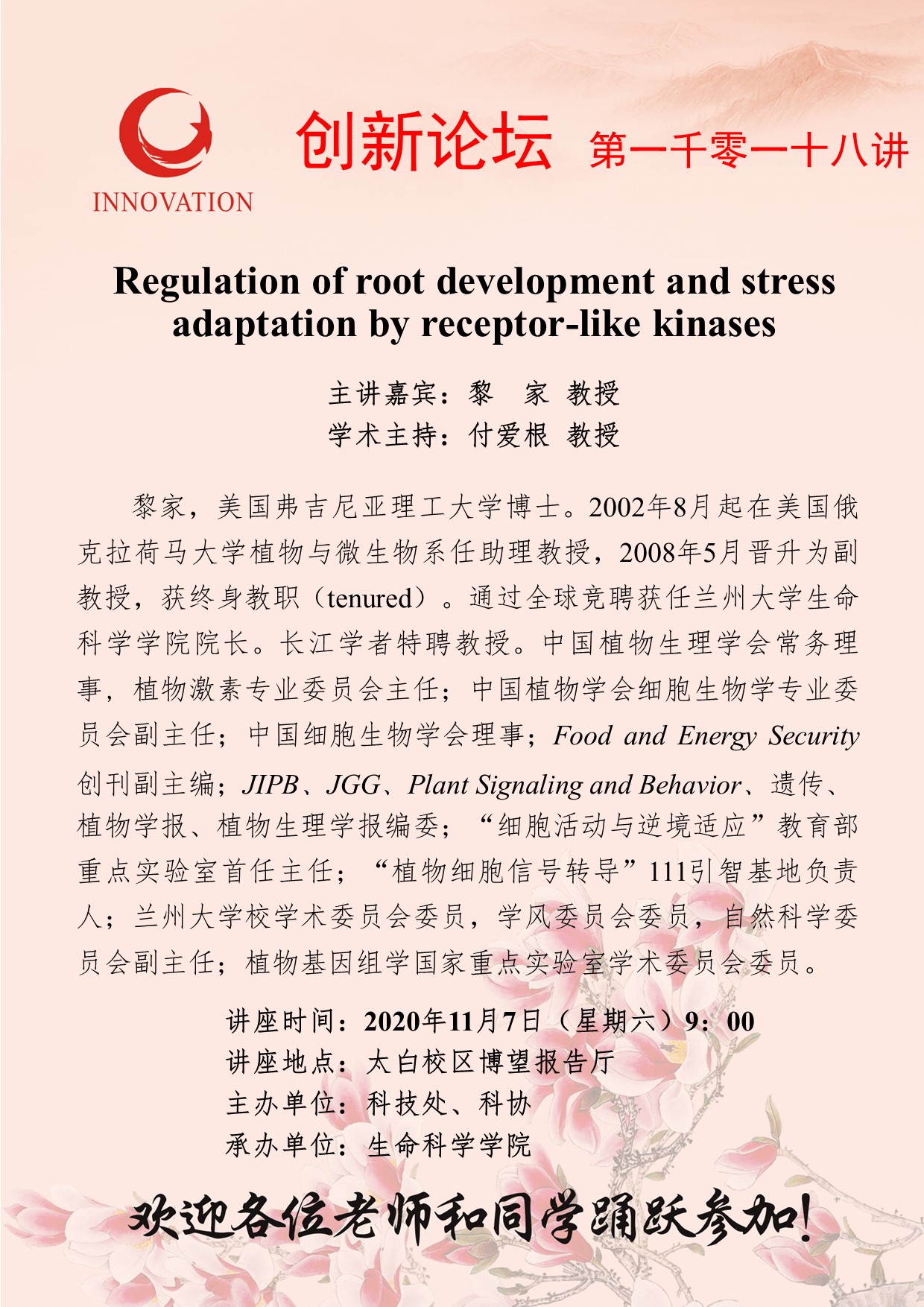 黎 家 教授 开云手机网页版登录入口创新论坛第一千零一十八讲:Regulation of root development and stress adaptation by receptor-like kinases 讲座时间 2020年11月7日(星期六)9:00 讲座地点 太白校区博望报告厅 讲座人介绍 黎 家 教授 讲座内容
