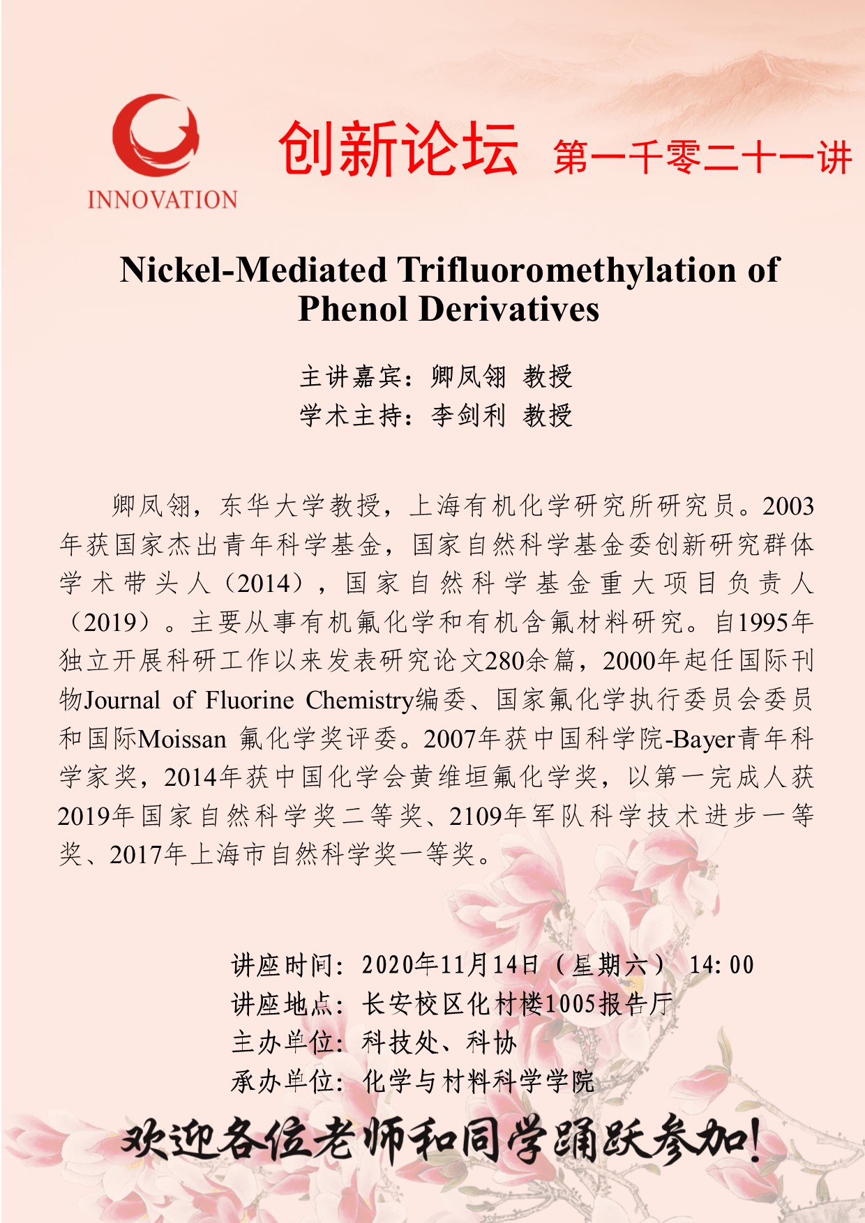 卿凤翎 教授 开云手机网页版登录入口创新论坛第一千零二十一讲:Nickel-Mediated Trifluoromethylation of Phenol Derivatives 讲座时间 2019年11月14日(星期六)14:00 讲座地点 长安校区化材楼1005报告厅 讲座人介绍 卿凤翎 教授 讲座内容