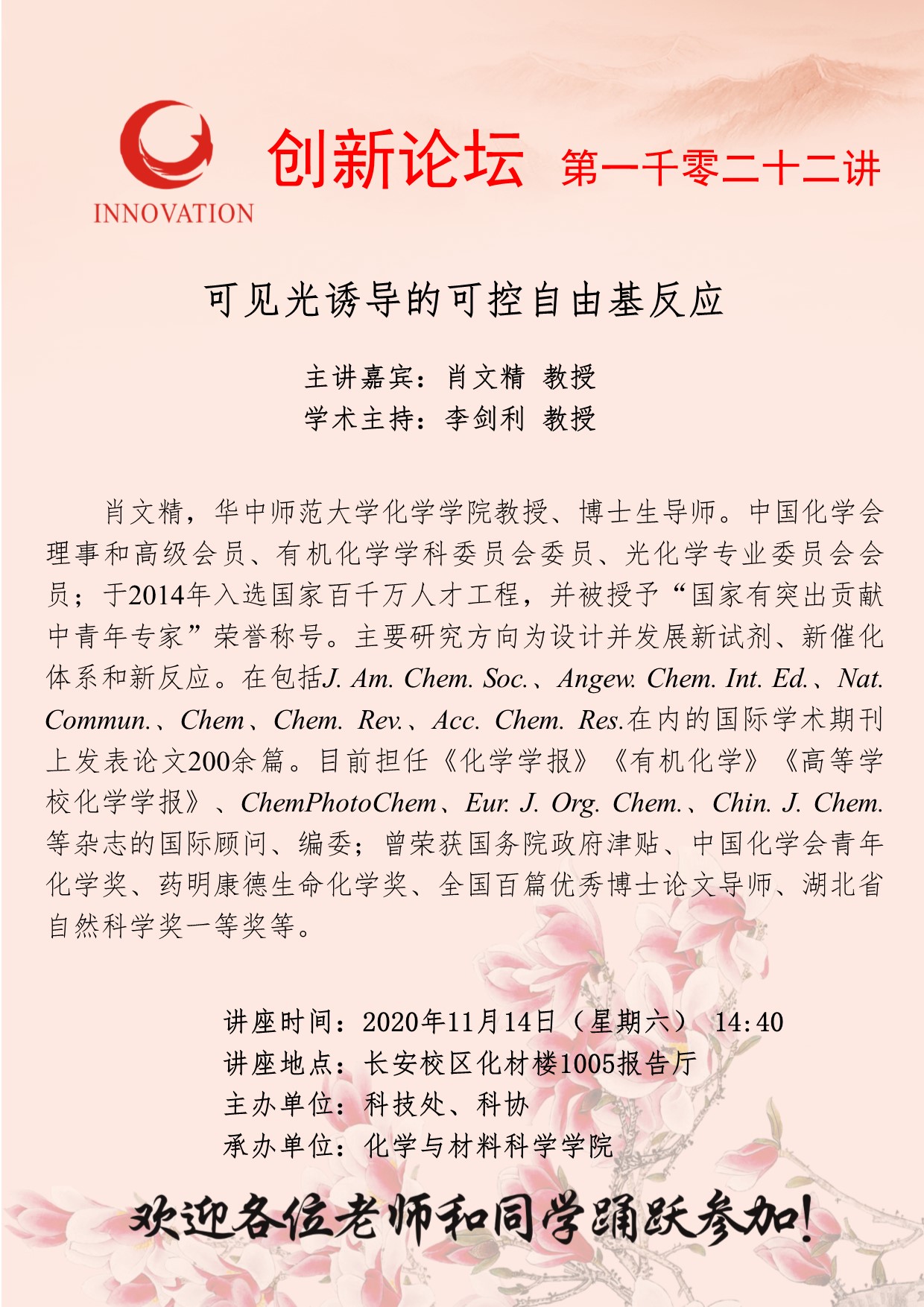 肖文精 教授 开云手机网页版登录入口创新论坛第一千零二十二讲:可见光诱导的可控自由基反应 讲座时间 2020年11月14日(周六)14:40 讲座地点 长安校区化材楼1005报告厅 讲座人介绍 肖文精 教授 讲座内容