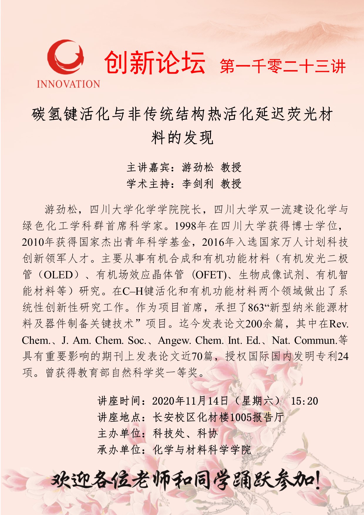 游劲松 教授 开云手机网页版登录入口创新论坛第一千零二十三讲:碳氢键活化与非传统结构热活化延迟荧光材料的发现 讲座时间 2020年 11月14日(周六)15:20 讲座地点 长安校区化材楼1005报告厅 讲座人介绍 游劲松 教授 讲座内容