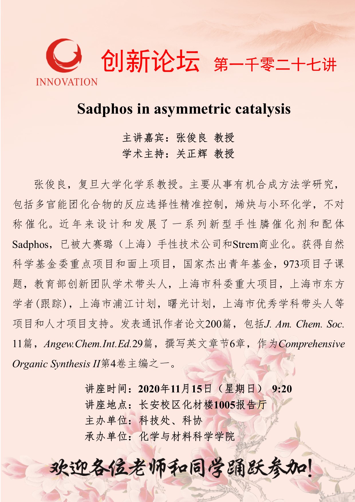 张俊良 教授 开云手机网页版登录入口创新论坛第一千零二十七讲:Sadphos in asymmetric catalysis 讲座时间 2020年11月15日(星期日)9:20 讲座地点 长安校区化材楼1005报告厅 讲座人介绍 张俊良 教授 讲座内容