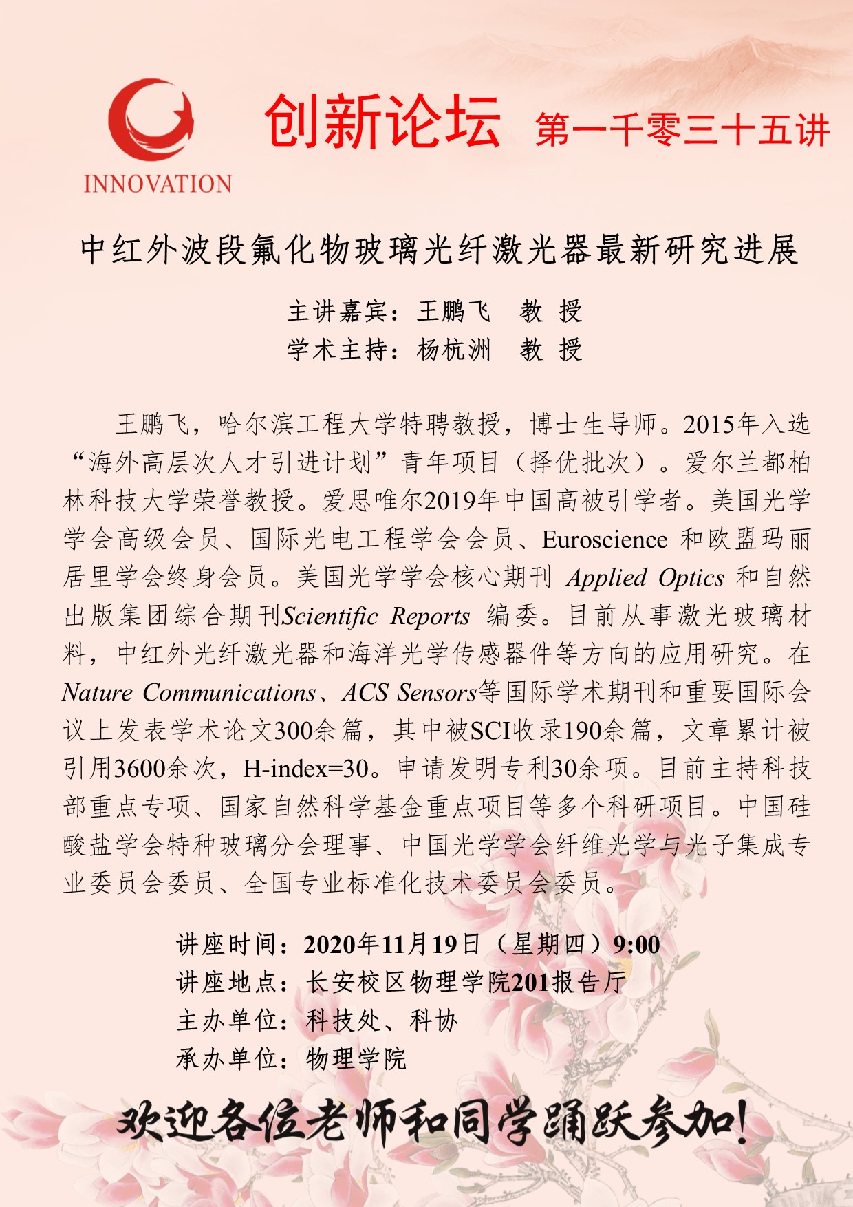 王鹏飞 教授 开云手机网页版登录入口创新论坛第一千零三十五讲:中红外波段氟化物玻璃光纤激光器最新研究进展 讲座时间 2020年11月19日(星期四) 9:00 讲座地点 长安校区物理学院201报告厅 讲座人介绍 王鹏飞 教授 讲座内容
