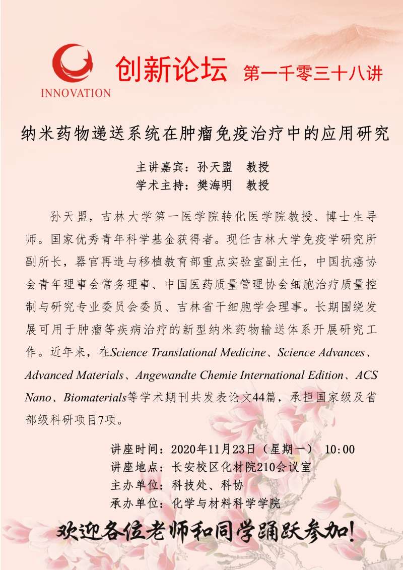 孙天盟 教授 开云手机网页版登录入口创新论坛第一千零三十八讲:纳米药物递送系统在肿瘤免疫治疗中的应用研究 讲座时间 2020年11月23日(星期一) 10:00 讲座地点 长安校区化材院210会议室 讲座人介绍 孙天盟 教授 讲座内容