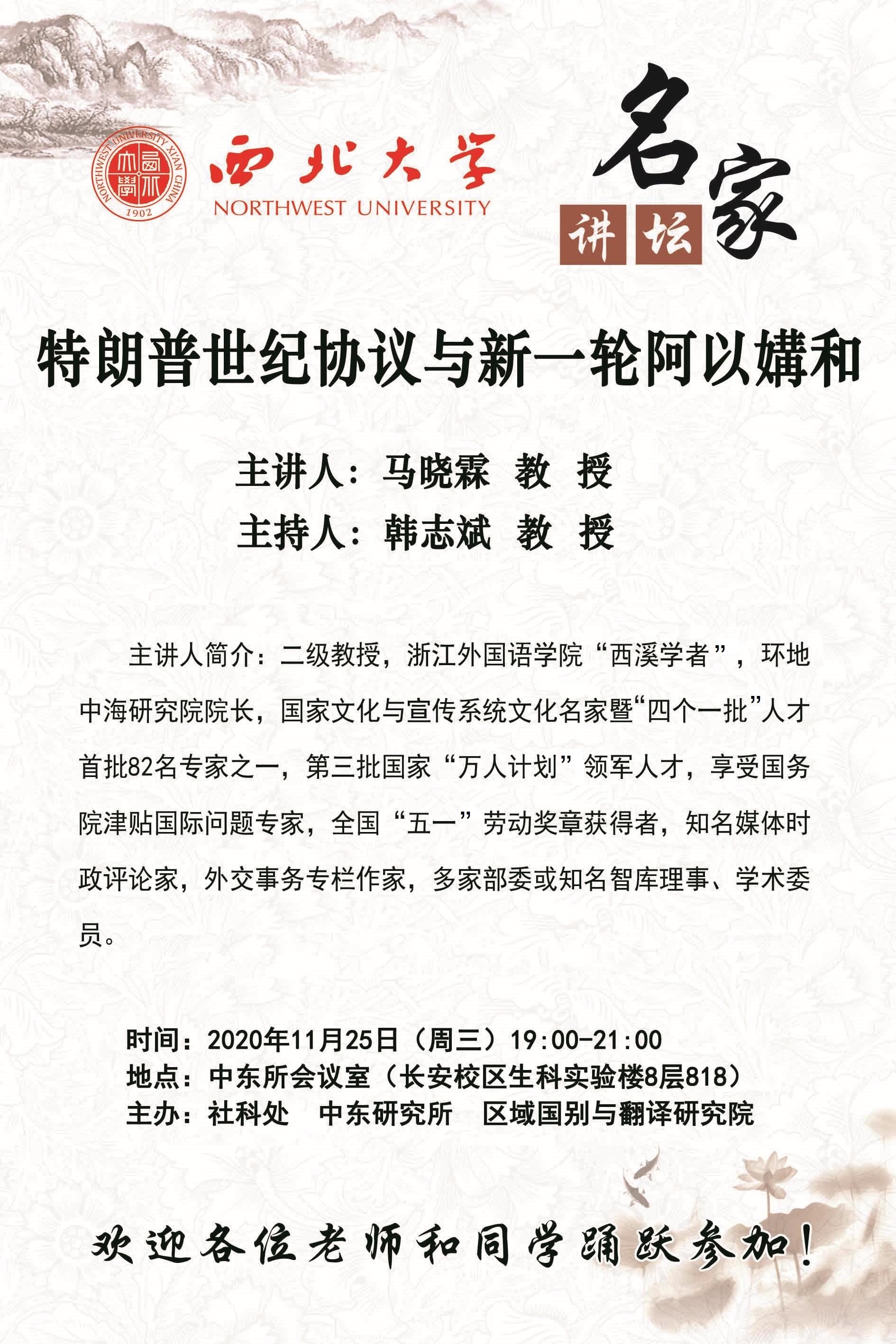 马晓霖 教授 名家讲坛:特朗普世纪协议与新一轮阿以媾和 讲座时间 2020年11月25日(周三)19:00-21:00 讲座地点 中东所会议室(长安校区生科实验楼8层818) 讲座人介绍 马晓霖 教授 讲座内容