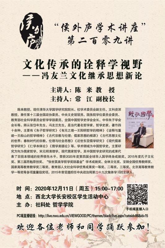 陈 来 教 授 侯外庐学术讲座第二百零九讲:文化传承的诠释学视野——冯友兰文化继承思想新论 讲座时间 2020年12月11日(周五)15:00-17:00 讲座地点 开云手机网页版登录入口长安校区学生活动中心 讲座人介绍 陈 来 教 授 讲座内容