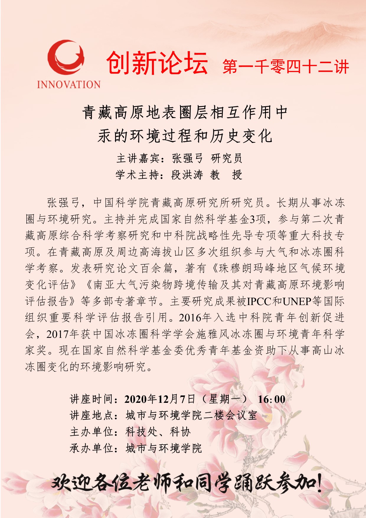 张强弓 研究员 开云手机网页版登录入口创新论坛第一千零四十二讲:青藏高原地表圈层相互作用中汞的环境过程和历史变化 讲座时间 2020年12月7日(星期一) 16:00 讲座地点 城市与环境学院二楼会议室 讲座人介绍 张强弓 研究员 讲座内容