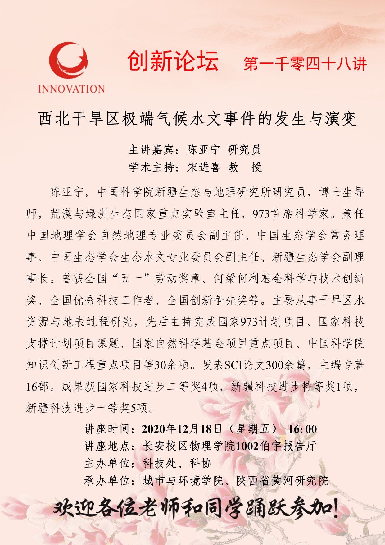 陈亚宁 研究员 开云手机网页版登录入口创新论坛第一千零四十八讲:西北干旱区极端气候水文事件的发生与演变研究 讲座时间 2020年12月18日(星期五)16:00 讲座地点 长安校区物理楼伯宇报告厅 讲座人介绍 陈亚宁 研究员 讲座内容