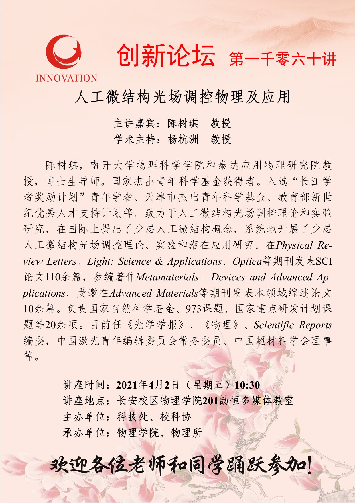 陈树琪 教授 开云手机网页版登录入口创新论坛第一千零六十讲:人工微结构光场调控物理及应用 讲座时间 2021年4月2日(星期五)10:30 讲座地点 长安校区物理学院201劼恒多媒体教室 讲座人介绍 陈树琪 教授 讲座内容