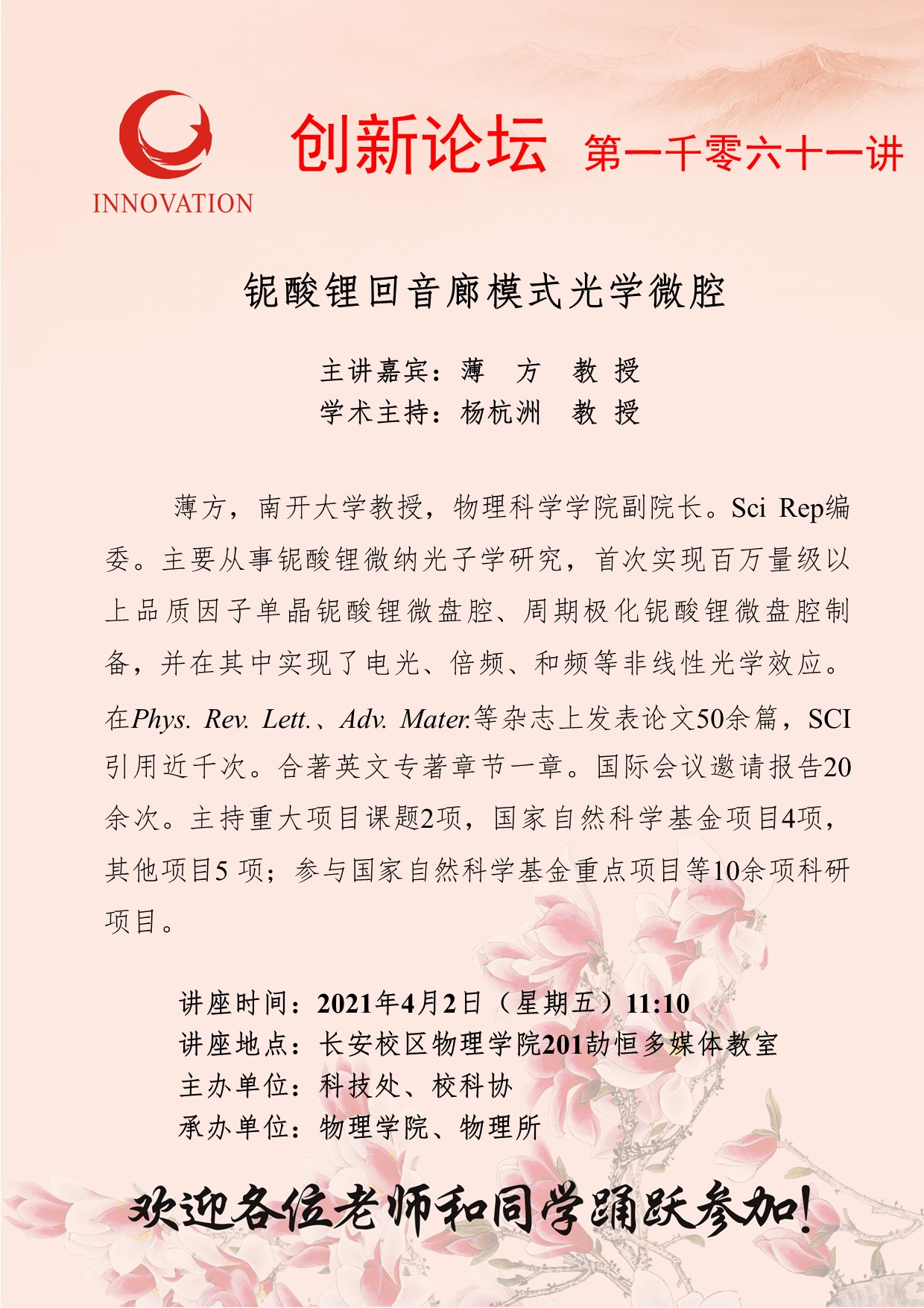 薄 方 教 授 开云手机网页版登录入口创新论坛第一千零六十一讲:铌酸锂回音廊模式光学微腔 讲座时间 2021年4月2日(星期五)11:10 讲座地点 长安校区物理学院201劼恒多媒体教室 讲座人介绍 薄 方 教 授 讲座内容