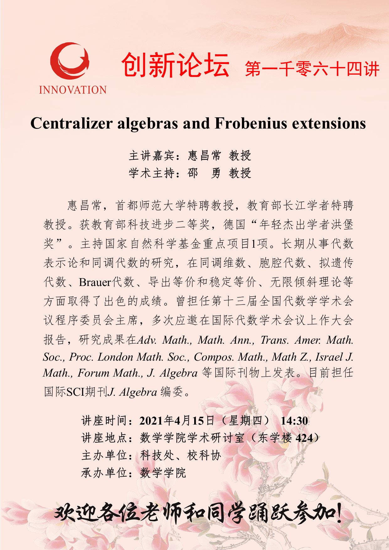 惠昌常 教授 创新论坛第一千零六十四讲:Centralizer algebras and Frobenius extensions 讲座时间 2021年4月15日(星期四) 14:30 讲座地点 数学学院学术研讨室(东学楼424) 讲座人介绍 惠昌常 教授 讲座内容