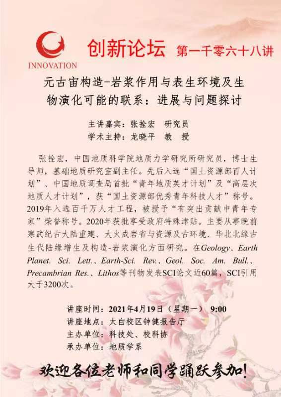 张拴宏 研究员 开云手机网页版登录入口创新论坛第一千零六十八讲:元古宙构造-岩浆作用与表生环境及生物演化可能的联系:进展与问题探讨 讲座时间 2021年4月19日(星期一) 9:00 讲座地点 太白校区钟健报告厅 讲座人介绍 张拴宏 研究员 讲座内容