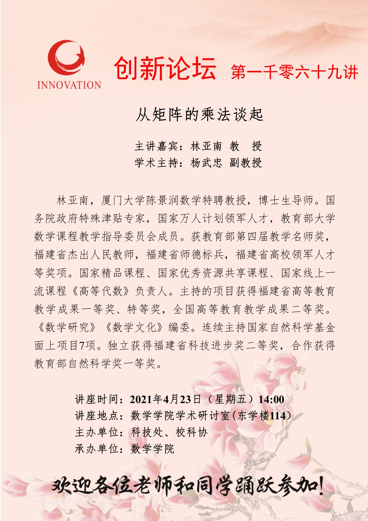林亚南 教授 开云手机网页版登录入口创新论坛第一千零六十九讲:从矩阵的乘法谈起 讲座时间 2021年4月23日(星期五)14:00 讲座地点 数学学院学术研讨室(东学楼114) 讲座人介绍 林亚南 教授 讲座内容