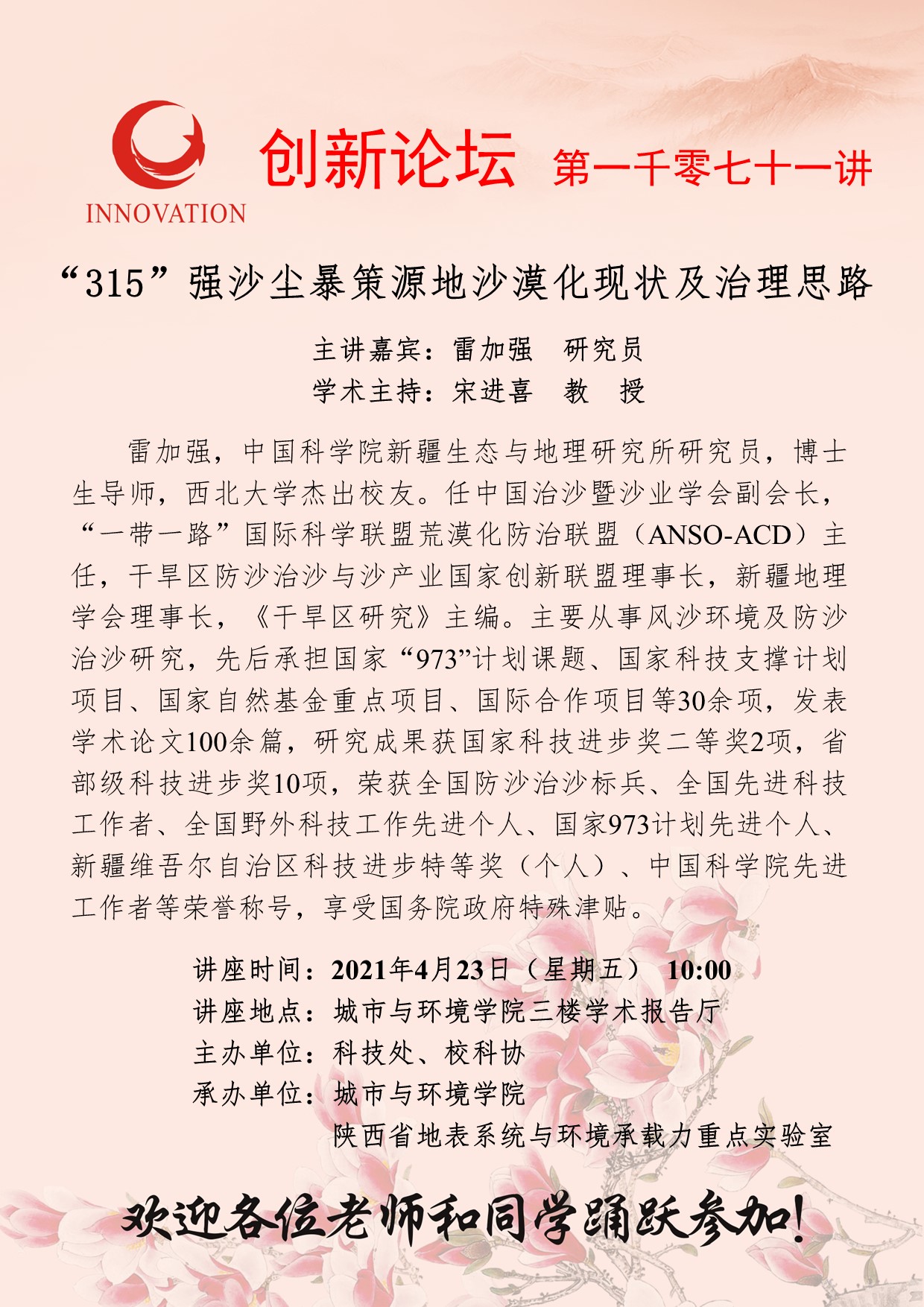 雷加强 研究员 开云手机网页版登录入口创新论坛第一千零七十一讲:“315”强沙尘暴策源地沙漠化现状及治理思路 讲座时间 2021年4月23日(星期五) 10:00 讲座地点 城市与环境学院三楼学术报告厅 讲座人介绍 雷加强 研究员 讲座内容