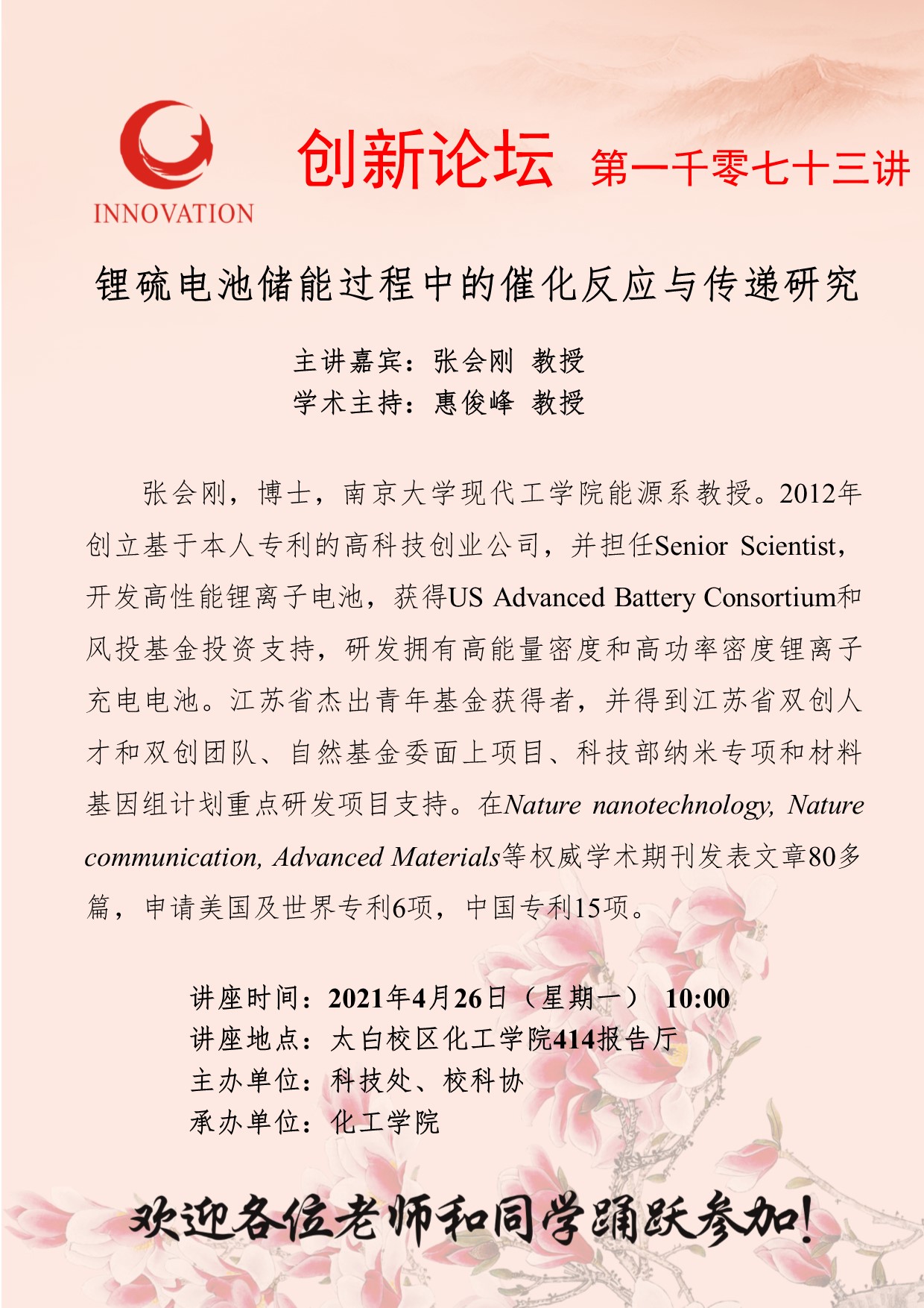 张会刚 教授 开云手机网页版登录入口创新论坛第一千零七十三讲:锂硫电池储能过程中的催化反应与传递研究 讲座时间 2021年4月26日(星期一) 10:00 讲座地点 太白校区化工学院414报告厅 讲座人介绍 张会刚 教授 讲座内容