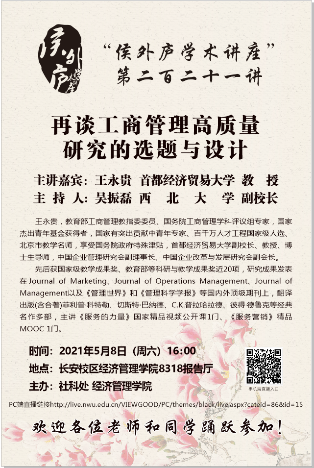 王永贵 教授 侯外庐学术讲座第二百二十一讲:再谈工商管理高质量研究的选题与设计 讲座时间 2021年5月8日(周六)16:00 讲座地点 长安校区经济管理学院8318报告厅 讲座人介绍 王永贵 教授 讲座内容