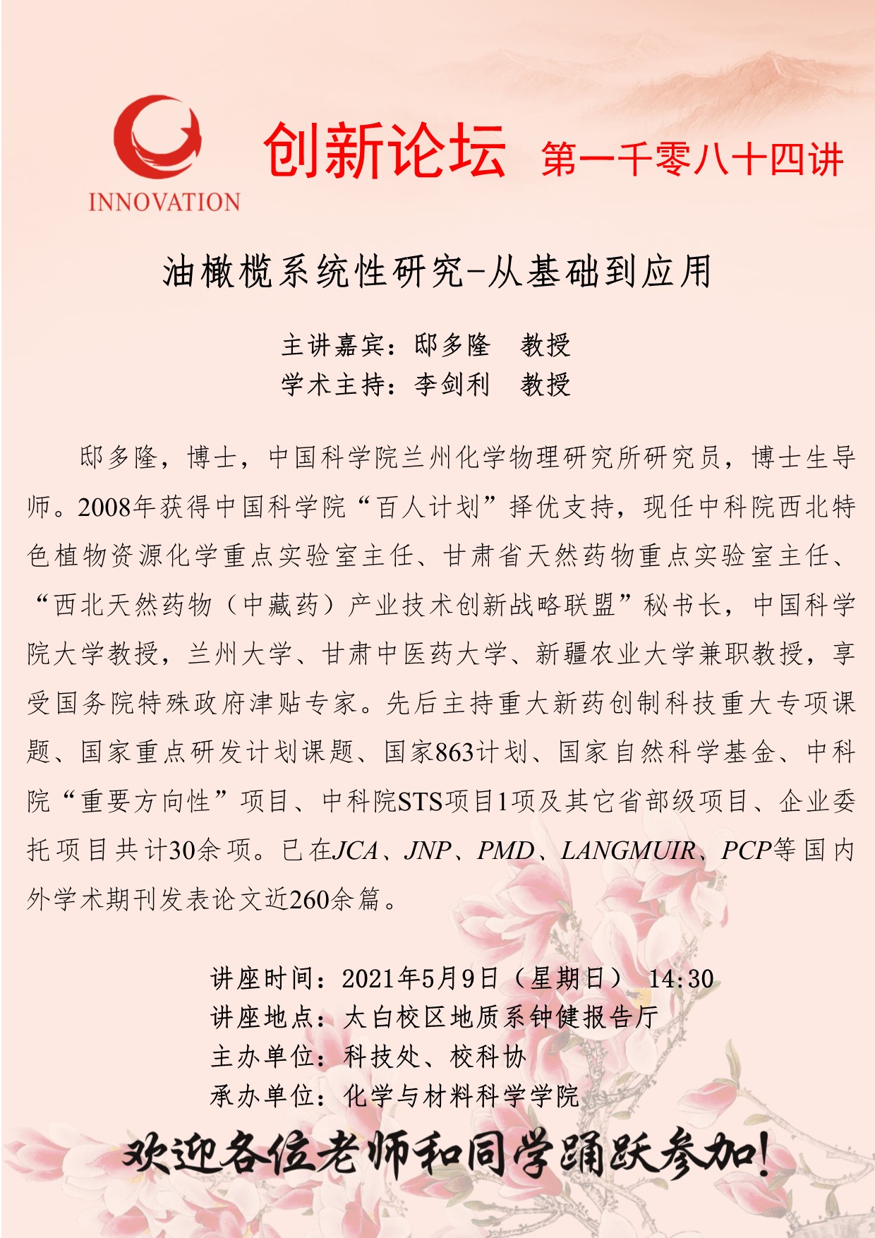 邸多隆 教授 开云手机网页版登录入口创新论坛第一千零八十四讲:油橄榄系统性研究-从基础到应用 讲座时间 2021年5月9日(星期日) 14:30 讲座地点 太白校区地质系钟健报告厅 讲座人介绍 邸多隆 教授 讲座内容