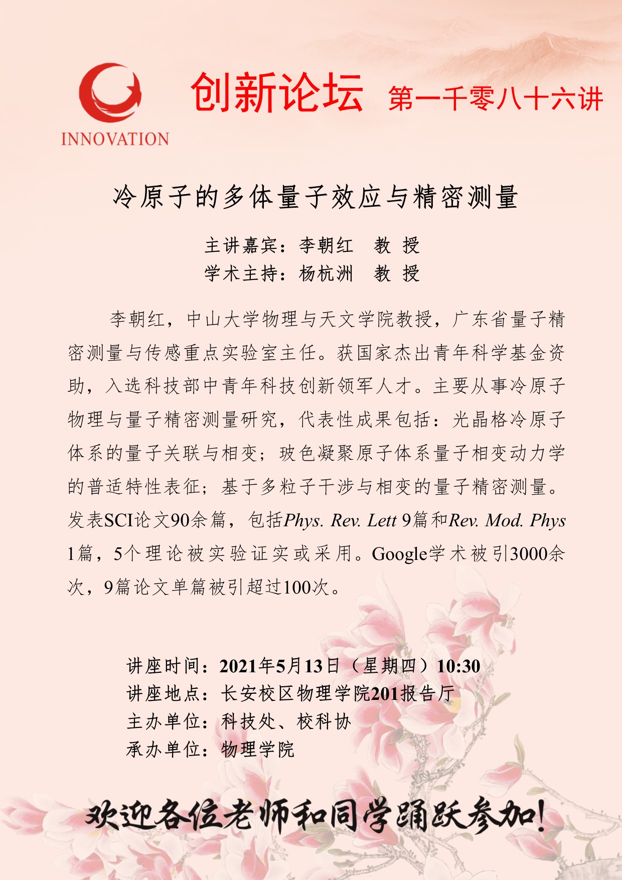 李朝红 教 授 开云手机网页版登录入口创新论坛第一千零八十六讲:冷原子的多体量子效应与精密测量 讲座时间 2021年5月13日(星期四)10:30 讲座地点 长安校区物理学院201报告厅 讲座人介绍 李朝红 教 授 讲座内容