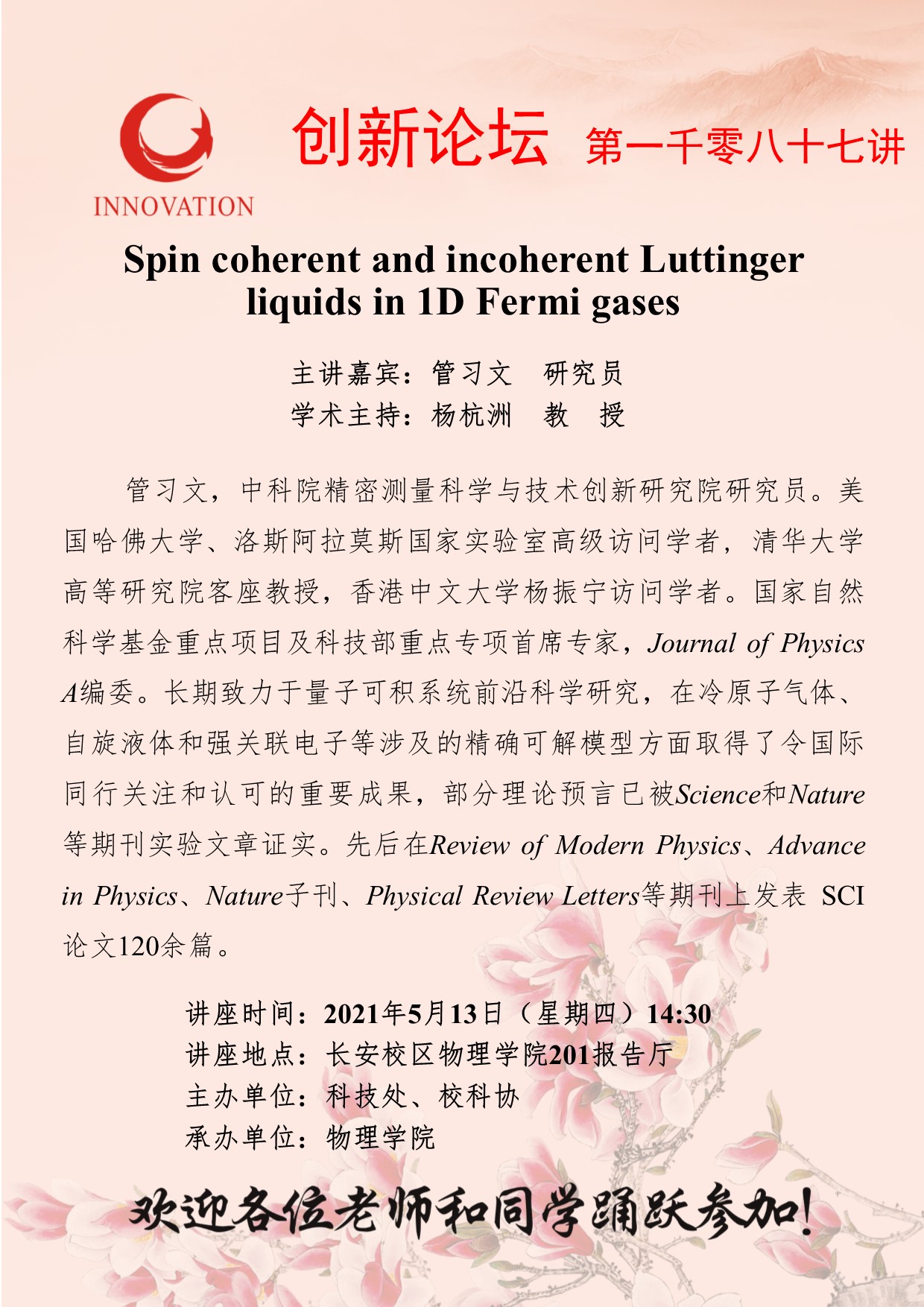 管习文 研究员 开云手机网页版登录入口创新论坛第一千零八十七讲:Spin coherent and incoherent Luttinger liquids in 1D Fermi gases 讲座时间 2021年5月13日(星期四)14:30 讲座地点 长安校区物理学院201报告厅 讲座人介绍 管习文 研究员 讲座内容