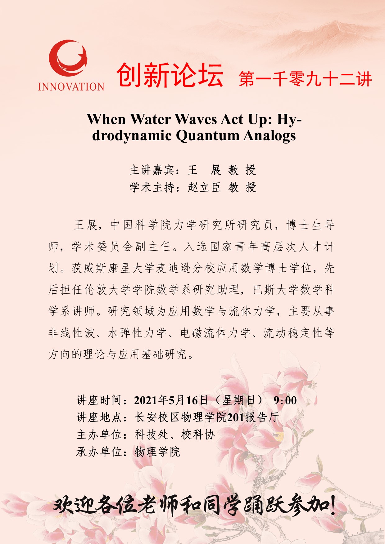 王 展 教 授 开云手机网页版登录入口创新论坛第一千零九十二讲:When Water Waves Act Up: Hydrodynamic Quantum Analogs 讲座时间 2021年5月16日(星期日) 9:00 讲座地点 长安校区物理学院201报告厅 讲座人介绍 王 展 教 授 讲座内容
