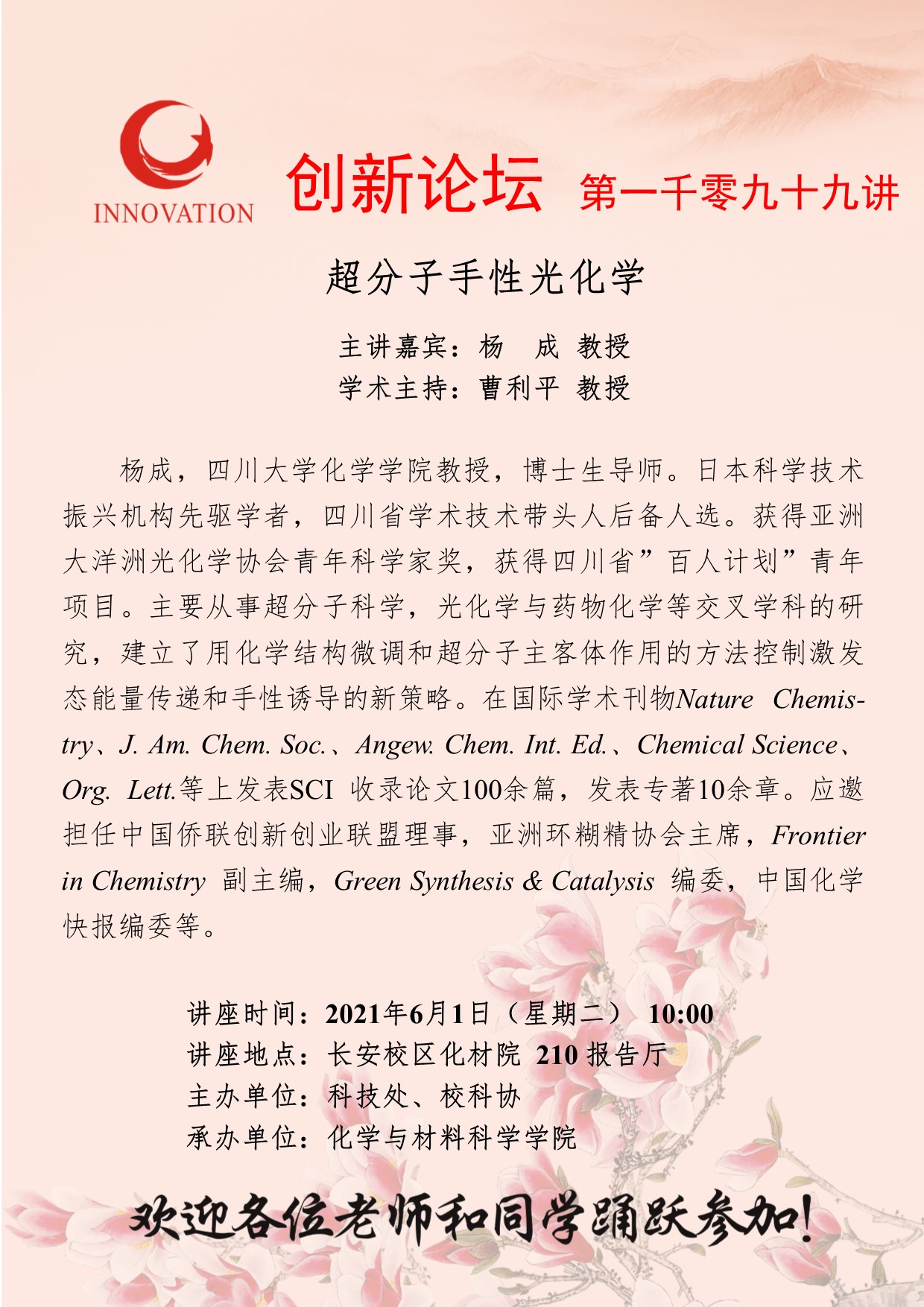 杨成 教授 开云手机网页版登录入口创新论坛第一千零九十九讲:超分子手性光化学 讲座时间 2021年6月1日(星期二) 10:00 讲座地点 长安校区化材院 210 报告厅 讲座人介绍 杨成 教授 讲座内容