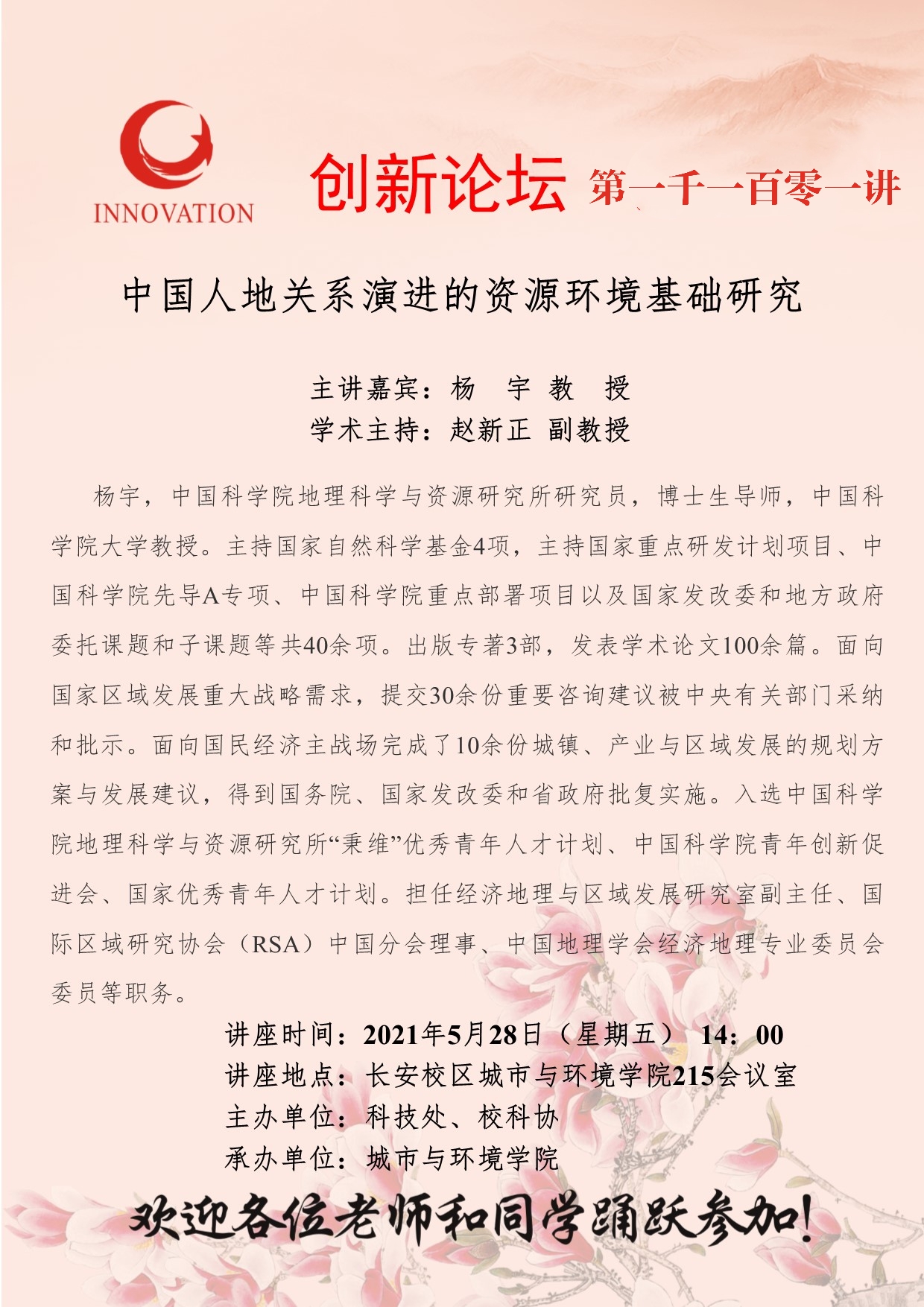杨宇 教授 开云手机网页版登录入口创新论坛第一千一百零一讲:中国人地关系演进的资源环境基础研究 讲座时间 2021年5月28日(星期五)14:00 讲座地点 长安校区城市与环境学院215会议室 讲座人介绍 杨宇 教授 讲座内容