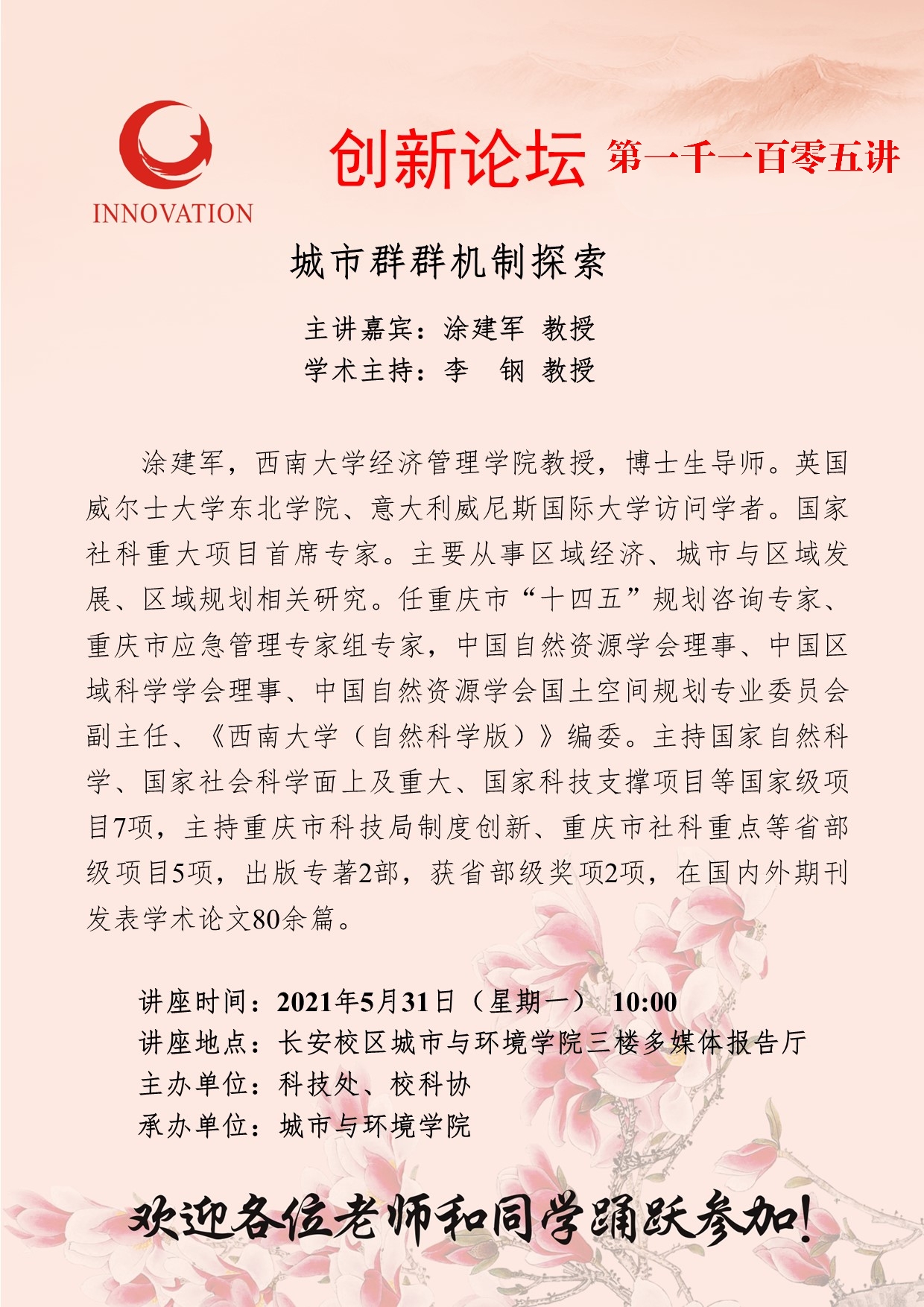 涂建军 教授 开云手机网页版登录入口创新论坛第一千一百零五讲:城市群群机制探索 讲座时间 2021年5月31日(星期一) 10:00 讲座地点 长安校区城市与环境学院三楼多媒体报告厅 讲座人介绍 涂建军 教授 讲座内容