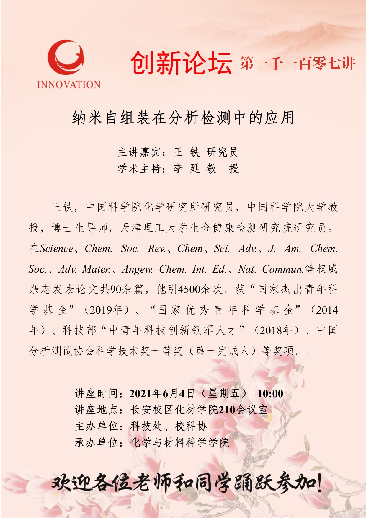 王 铁 研究员 开云手机网页版登录入口创新论坛第一千一百零七讲:纳米自组装在分析检测中的应用 讲座时间 2021年6月4日(星期五) 10:00 讲座地点 长安校区化材学院210会议室 讲座人介绍 王 铁 研究员 讲座内容