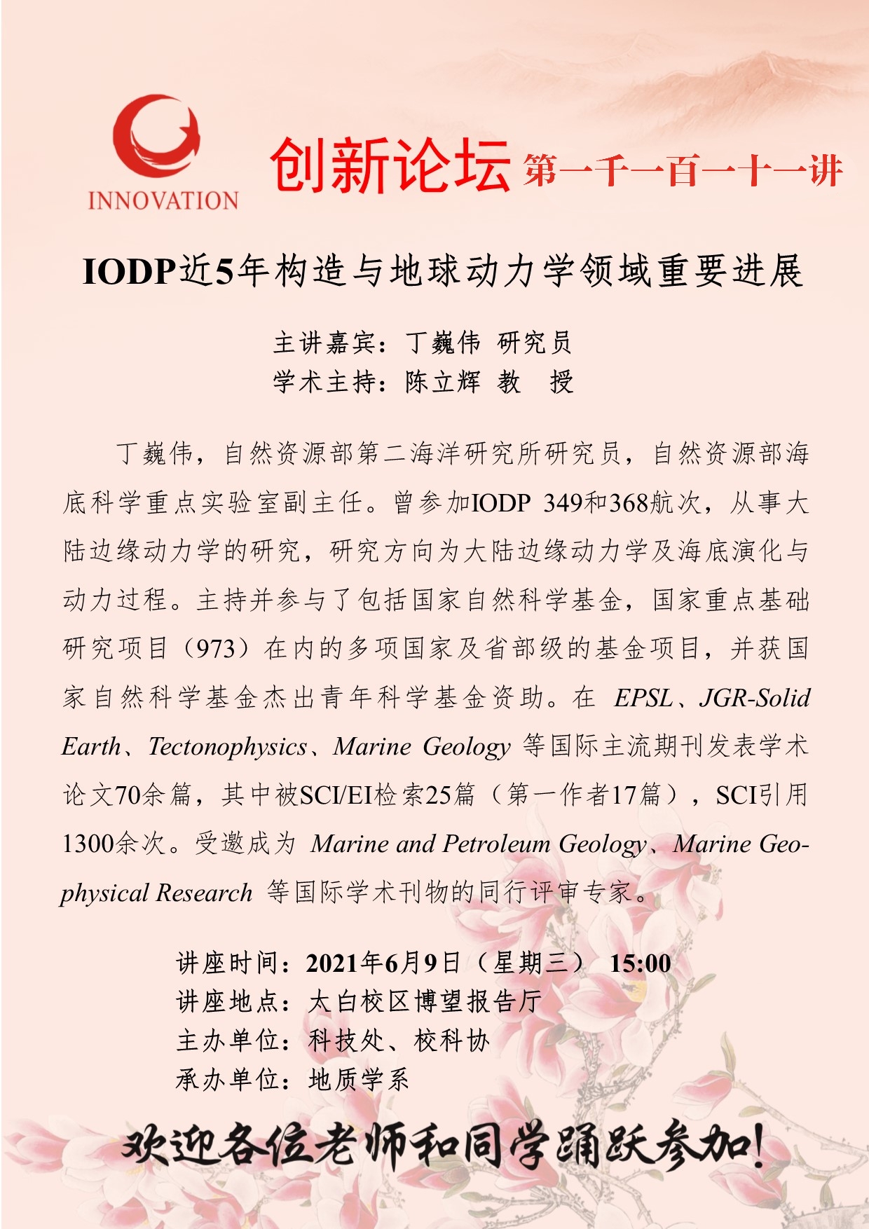 丁巍伟 研究员 开云手机网页版登录入口创新论坛第一千一百一十一讲:IODP近5年构造与地球动力学领域重要进展 讲座时间 2021年6月9日(星期三) 15:00 讲座地点 太白校区博望报告厅 讲座人介绍 丁巍伟 研究员 讲座内容
