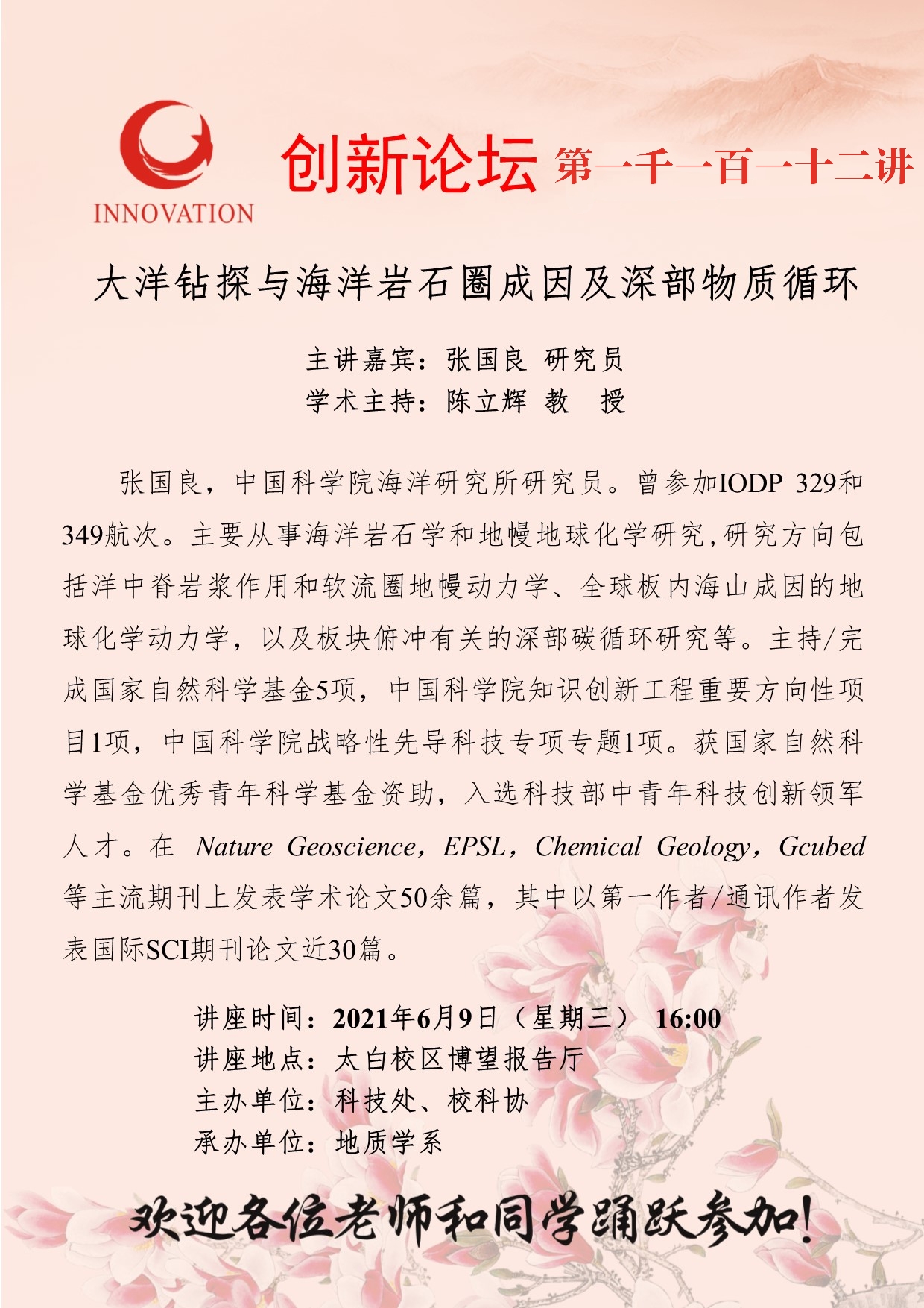 张国良 研究员 开云手机网页版登录入口创新论坛第一千一百一十二讲:大洋钻探与海洋岩石圈成因及深部物质循环 讲座时间 2021年6月9日(星期三) 16:00 讲座地点 太白校区博望报告厅 讲座人介绍 张国良 研究员 讲座内容
