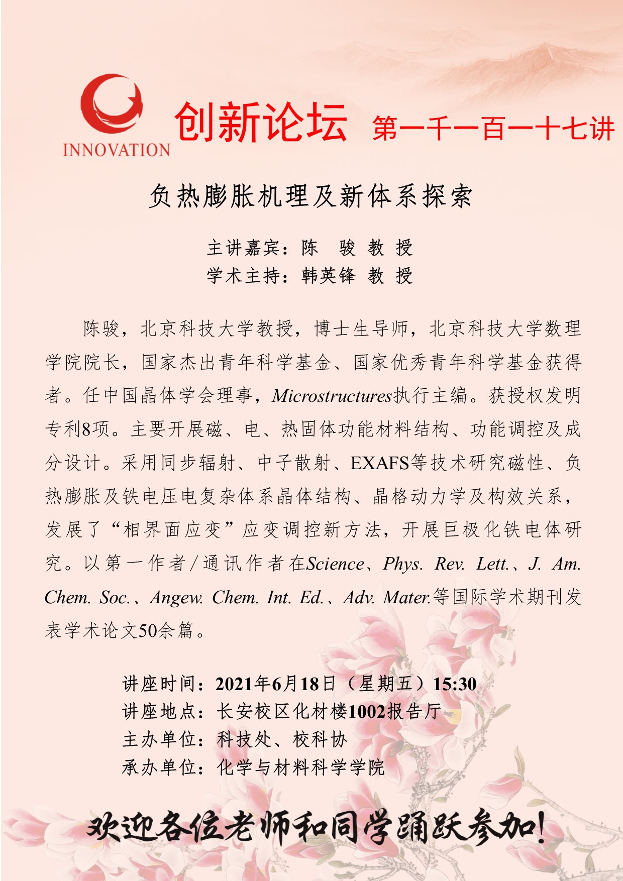陈骏 教授 开云手机网页版登录入口创新论坛第一千一百一十七讲:负热膨胀机理及新体系探索 讲座时间 2021年6月18日(星期五)15:30 讲座地点 长安校区化材楼1002报告厅 讲座人介绍 陈骏 教授 讲座内容