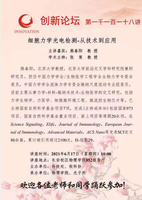 熊春阳 教 授 开云手机网页版登录入口创新论坛第一千一百一十八讲:细胞力学光电检测-从技术到应用 讲座时间 2021年6月17日(星期四)10:00 讲座地点 长安校区物理学院852报告厅 讲座人介绍 熊春阳 教 授 讲座内容