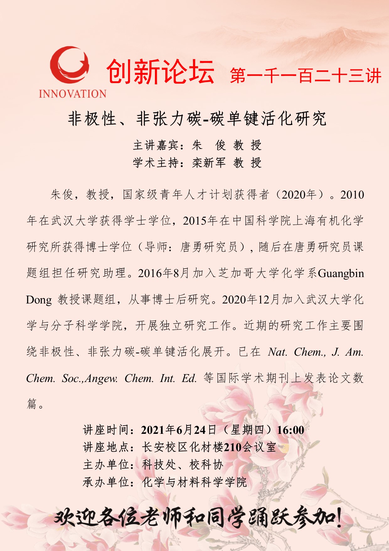 朱 俊 教 授 开云手机网页版登录入口创新论坛第一千一百二十三讲:非极性、非张力碳-碳单键活化研究 讲座时间 2021年6月24日(星期四)16:00 讲座地点 长安校区化材楼210会议室 讲座人介绍 朱 俊 教 授 讲座内容