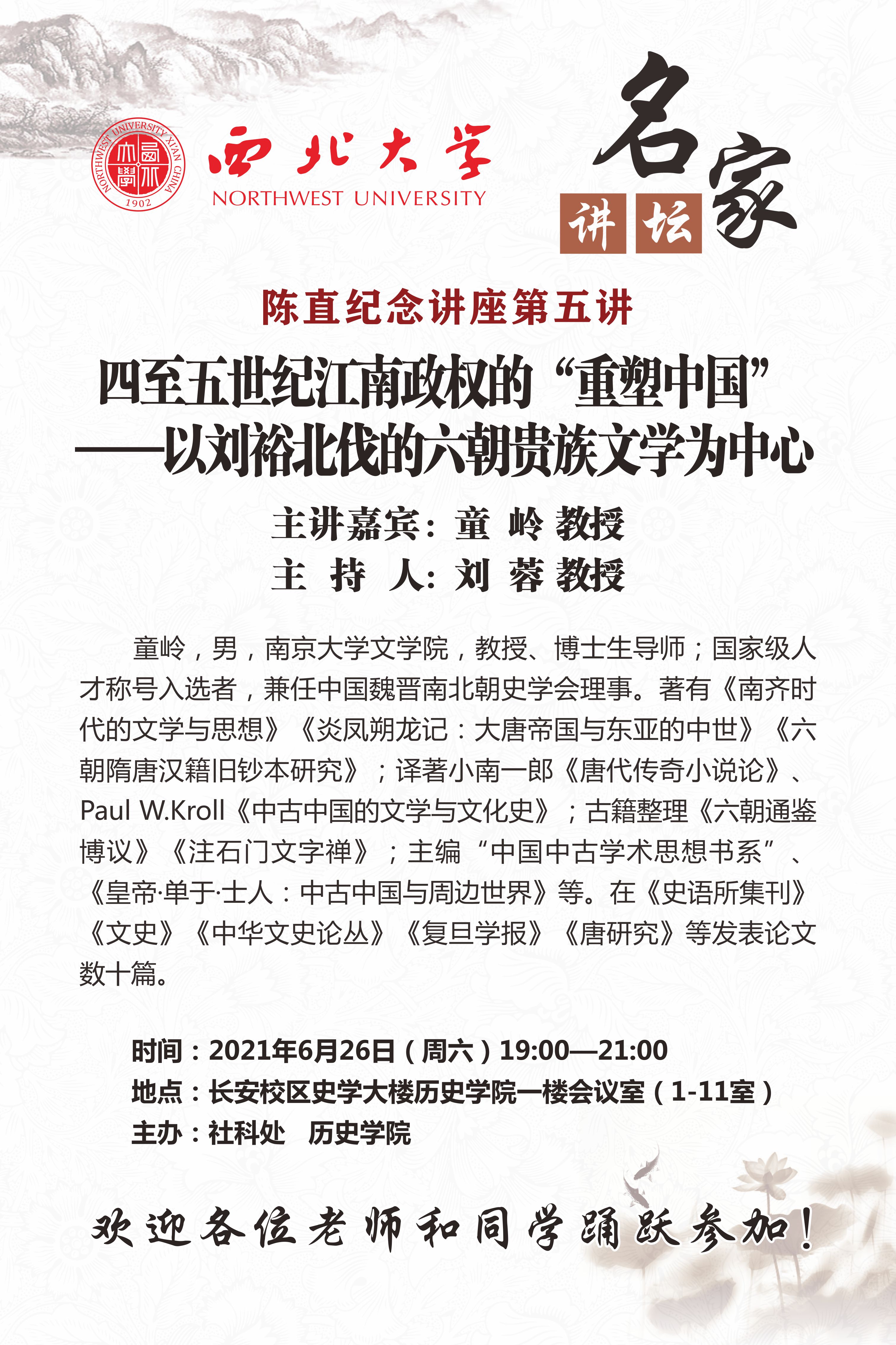 童岭 教授 名家讲坛:四至五世纪江南政权的“重塑中国”——以刘裕北伐的六朝贵族文学为中心 讲座时间 2021年6月26日(周六)19:00 讲座地点 长安校区历史学院一层会议室(1-11室) 讲座人介绍 童岭 教授 讲座内容